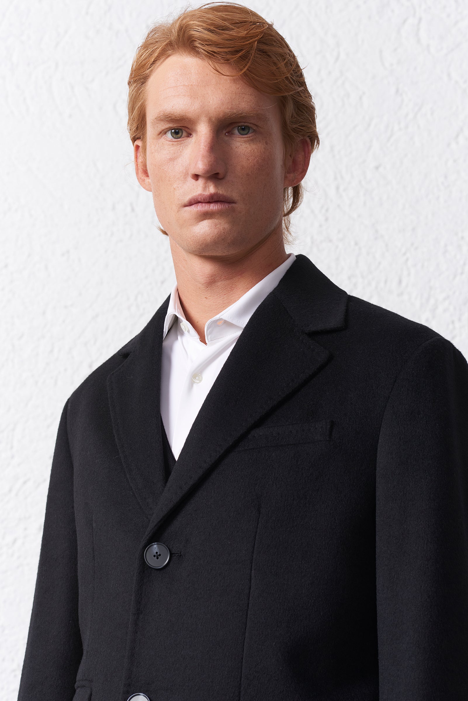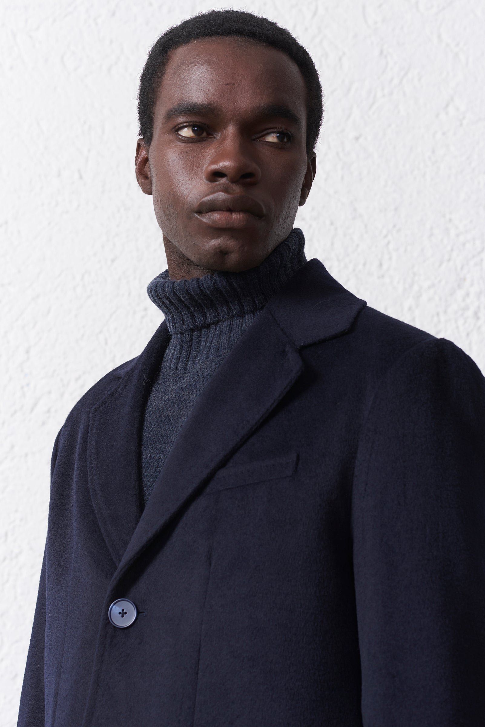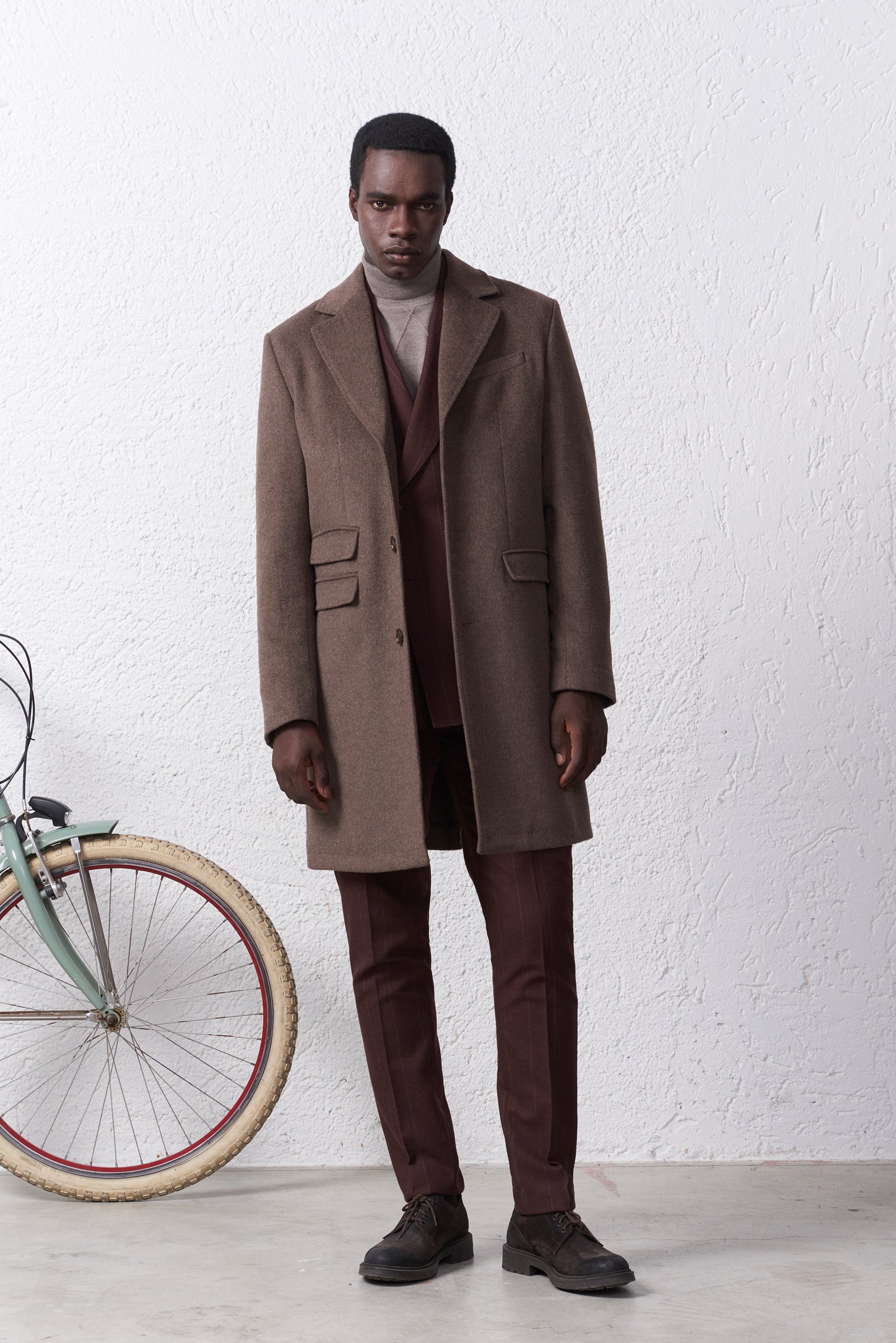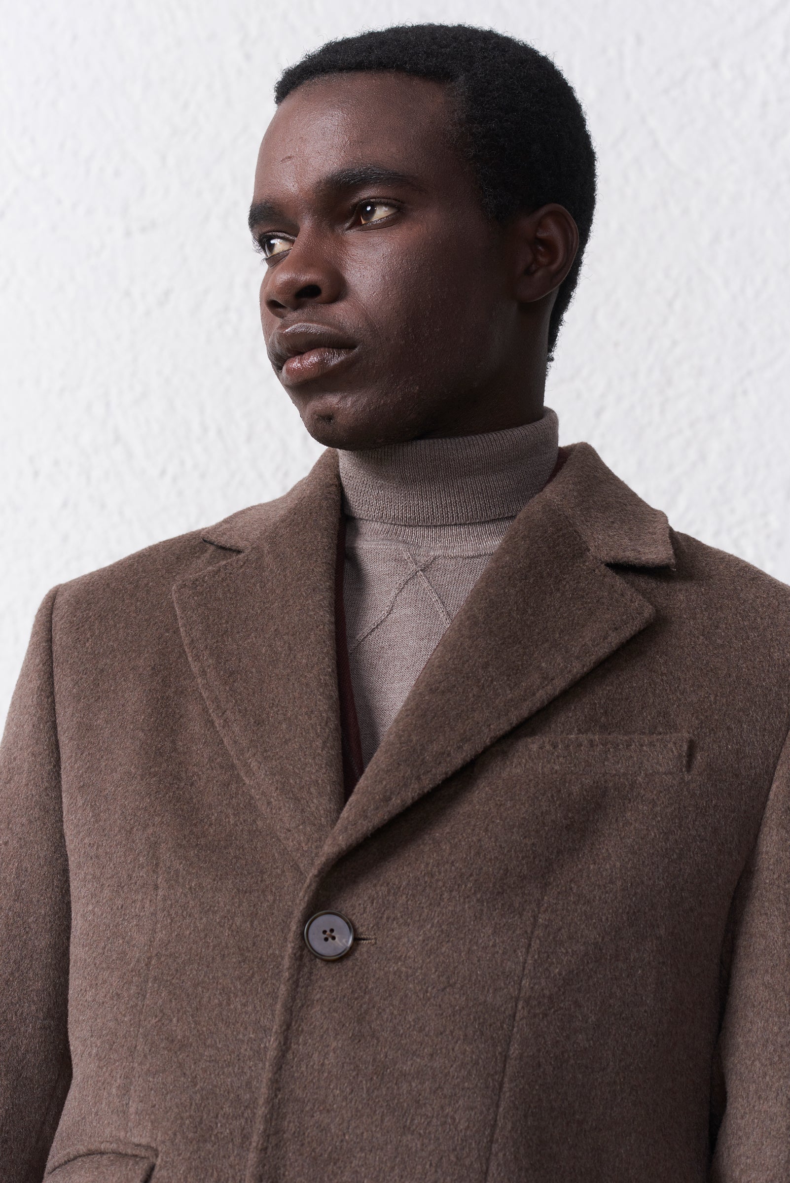 Cappotto uomo modello baronetto, confezionato in un pregiato tessuto misto lana a pelo corto, perfetto per offrire sia isolamento termico che una sensazione di leggerezza e praticità nell’uso quotidiano. La linea è moderna ed essenziale, caratterizzata da una chiusura frontale monopetto a due bottoni e dal classico collo a revers. Sul davanti sono presenti tasche a filetto e un taschino sul petto, dettagli di ispirazione sartoriale che donano pulizia e funzionalità. Il retro del capo si distingue per la presenza della martingala con doppio bottone, pensata per offrire maggiore definizione alla silhouette e valorizzare lo spacco centrale, dettaglio che facilita i movimenti e garantisce comfort in ogni situazione. Il misto lana pelo corto conferisce al cappotto una texture raffinata e resistente, ideale sia per abbinamenti formali che casual.