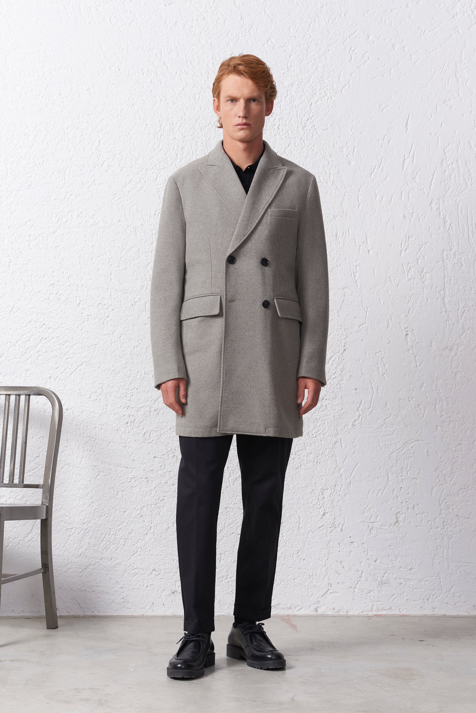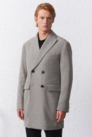 Cappotto doppiopetto uomo trapuntato, in misto lana grigio, tasche con pattina. Caldo, elegante e versatile per look da giorno e sera.