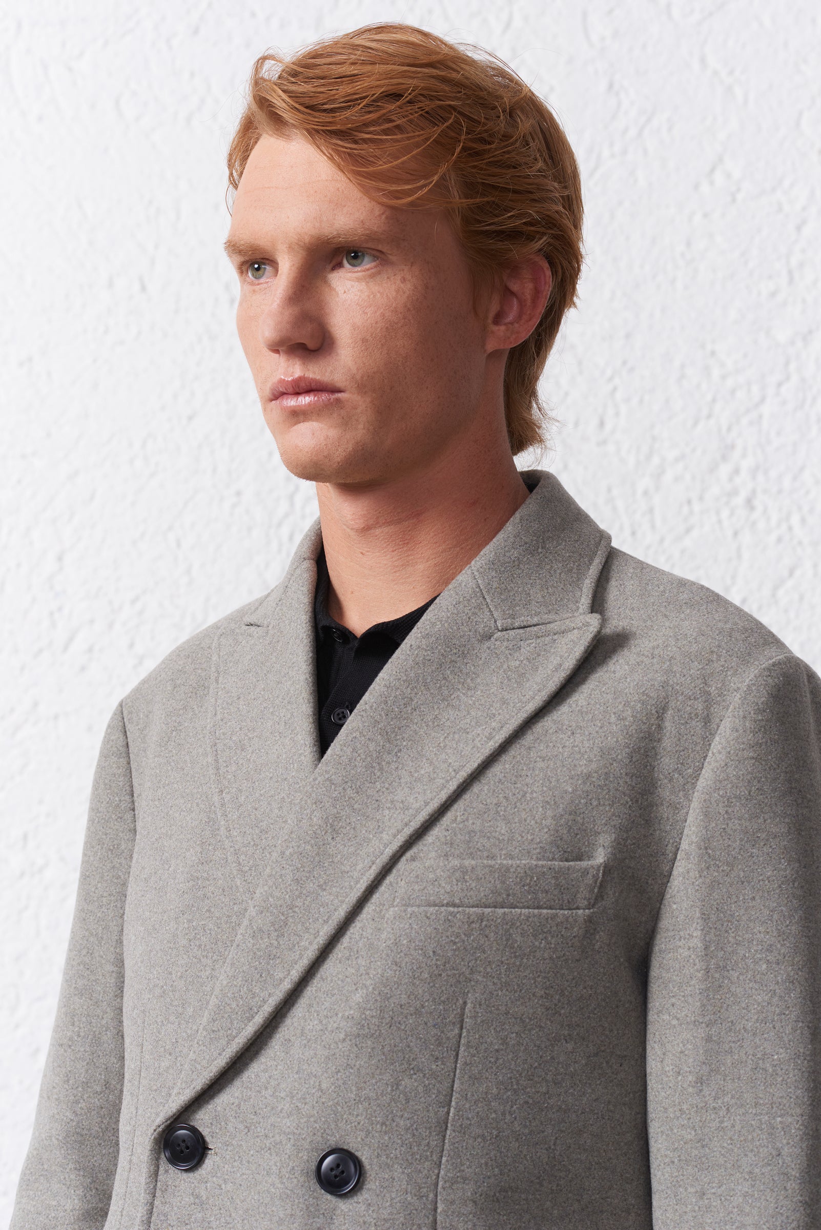 Cappotto uomo doppiopetto in pregiato tessuto misto lana grigio, ideale per affrontare l’inverno con stile e comfort. La lavorazione con trapunta interna sul corpo assicura elevate proprietà termiche e una piacevole sensazione di calore senza appesantire la silhouette. Il design sartoriale è sottolineato dal rever classico, dalla doppia fila di bottoni scuri a contrasto, e dalle ampie tasche applicate con pattina che aggiungono un tocco funzionale e moderno. Il taglio regolare e la lunghezza media garantiscono massima versatilità per abbinamenti sia casual sia formali.