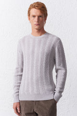 Maglia girocollo da uomo realizzata in misto lana, perfetta per la stagione fredda grazie all’elevato comfort termico e alla piacevole morbidezza. Il capo si distingue per una lavorazione a trecce verticali tono su tono che si alternano a coste piatte, creando un elegante effetto tridimensionale che esalta la struttura del tessuto e valorizza qualsiasi fisicità. I polsini, il fondo e il girocollo sono rifiniti con costine elastiche 1/1 che garantiscono vestibilità stabile, protezione dal freddo e lunga durata. Il design classico della maglia viene rivisitato con un tocco sartoriale contemporaneo, ideale sia per l’ufficio sia per il tempo libero.