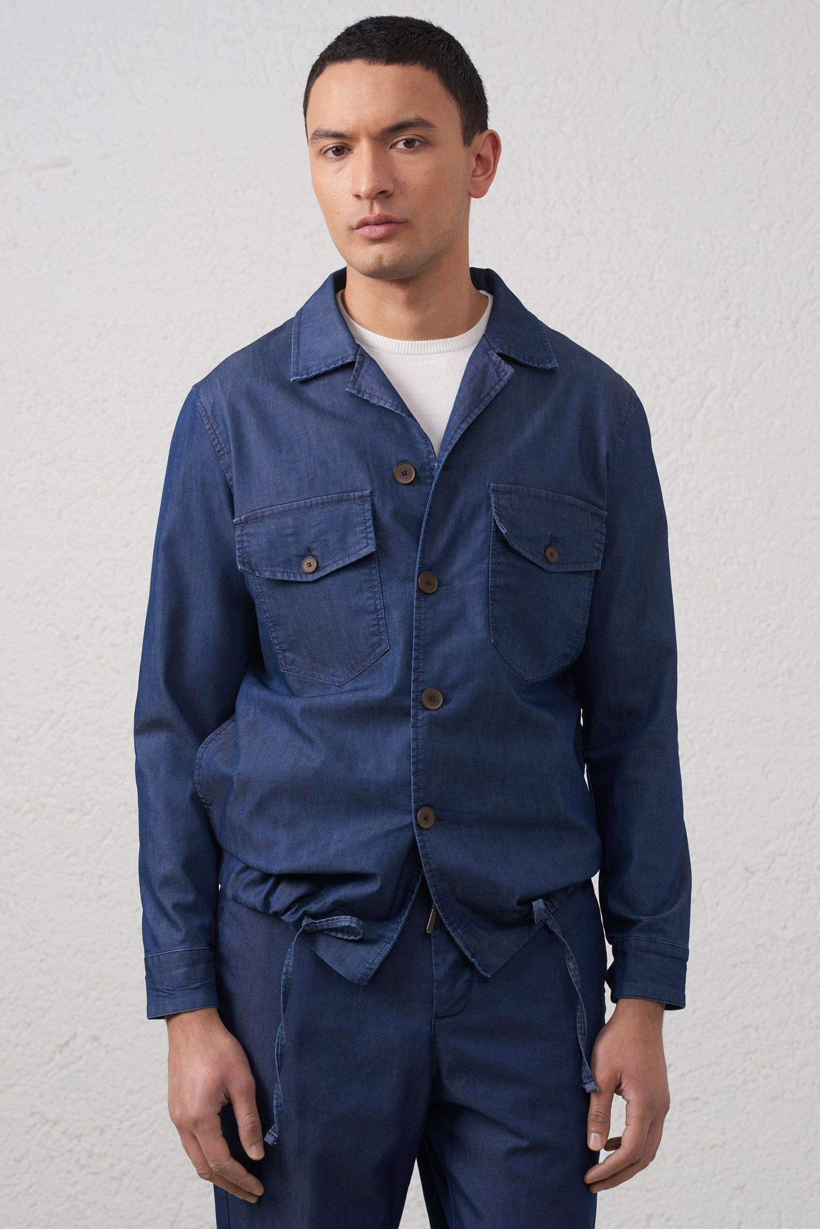 Overshirt uomo in denim 100% cotone con tasconi frontali e laccio regolabile in vita. Perfetta come giacca leggera dal look workwear contemporaneo.