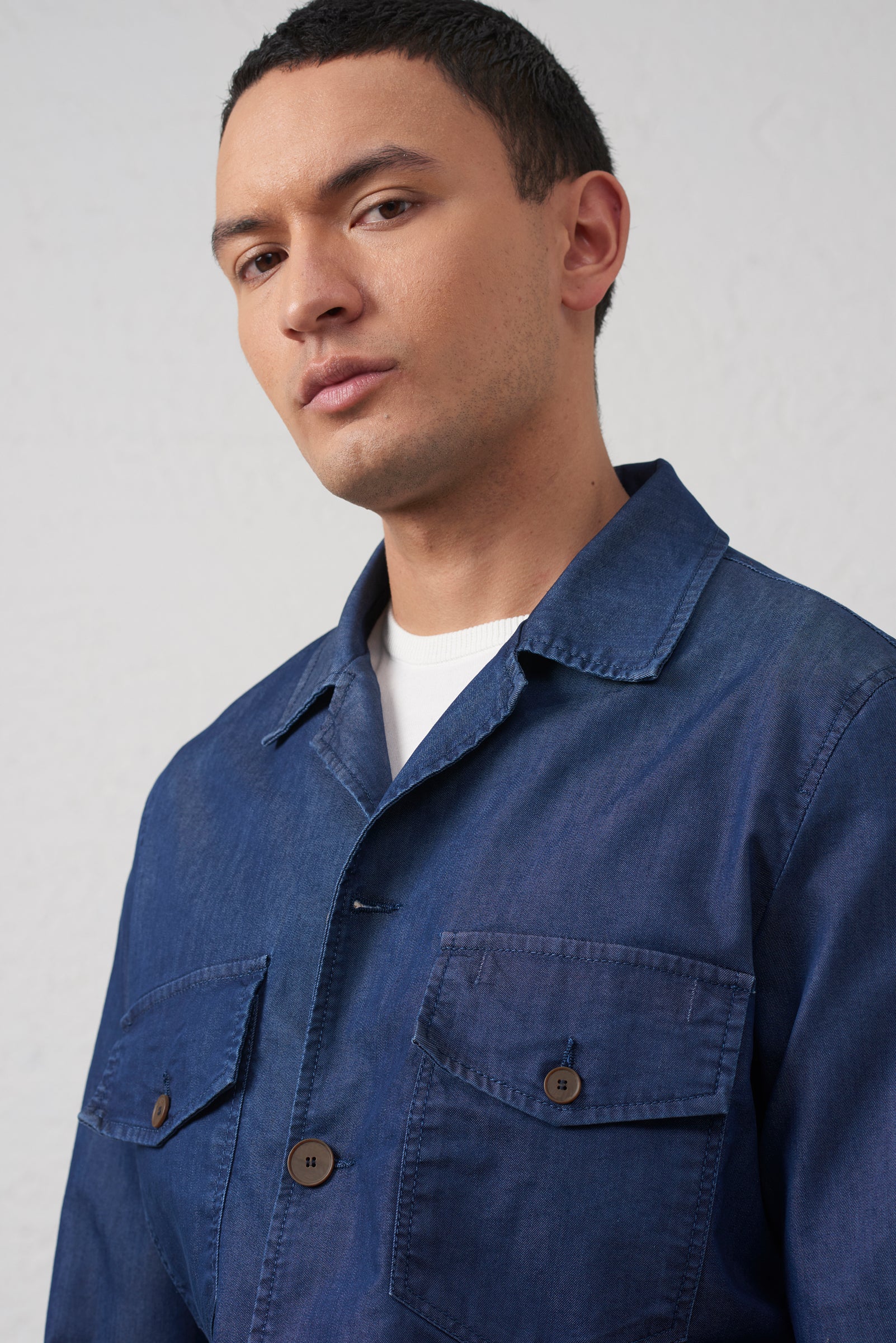 Realizzata in leggero di cotone effetto jeans, l’overshirt garantisce comfort, traspirabilità e una naturale morbidezza al tatto, ideale per essere indossata come camicia strutturata o come giacca leggera nelle mezze stagioni.