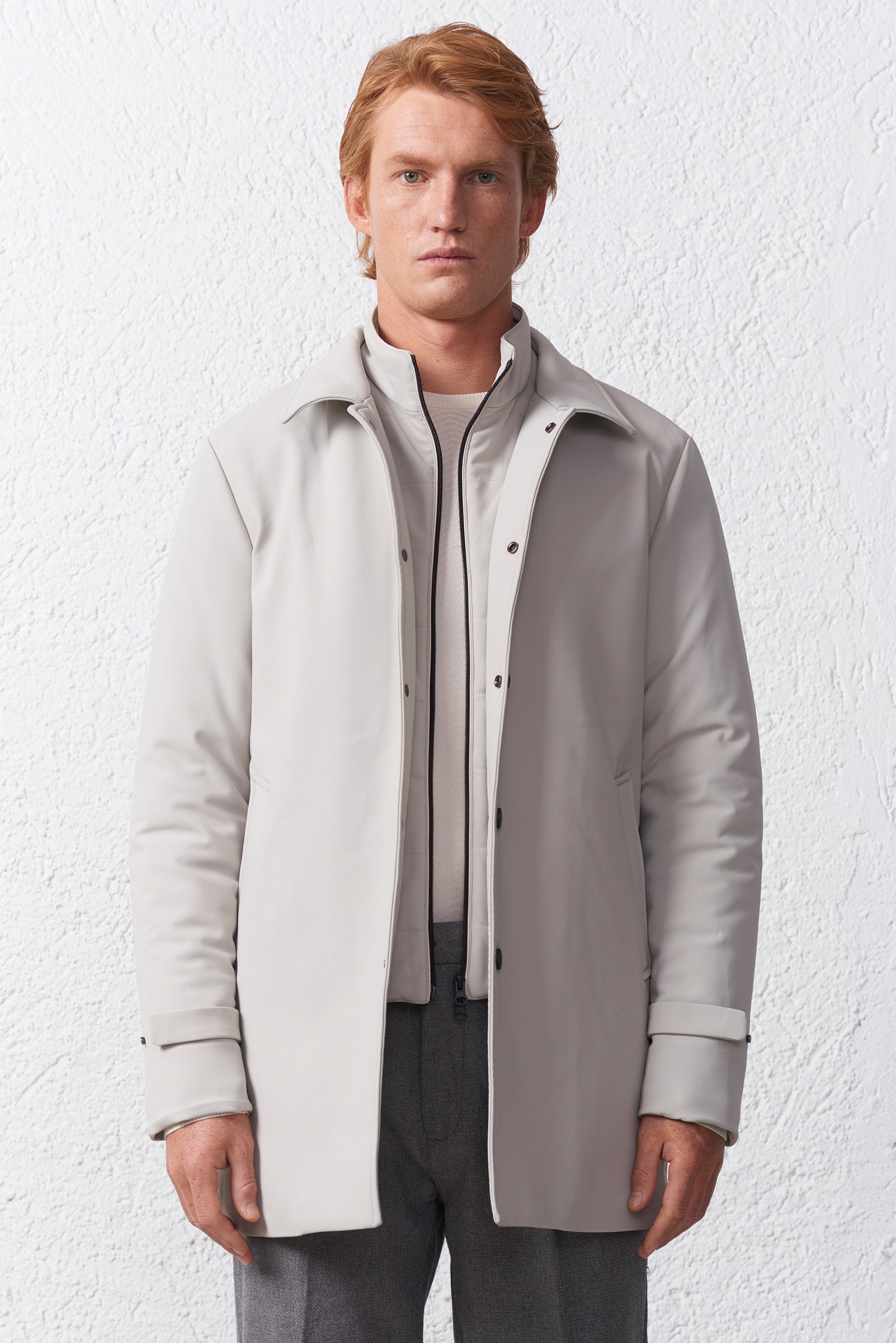 Giubbino trench da uomo dal design essenziale e versatile, perfetto per chi cerca protezione e stile nelle mezze stagioni e in inverno. Il modello è realizzato in tessuto tecnico idrorepellente che offre massima resistenza ad acqua e vento, mantenendo impermeabilità e traspirabilità. L’imbottitura ecologica interna garantisce calore e leggerezza, senza rinunciare alla sostenibilità. Collo camicia pulito e raffinato, chiusura frontale con bottoni e comoda zip a doppio cursore. Elemento distintivo: la pettorina interna removibile che, grazie alla zip integrata, trasforma questo trench in un capo da portare sia come giubbotto leggero sia come vero capospalla invernale. Le tasche laterali a filetto aggiungono praticità e regolano la linea del capo, mentre la tonalità chiara dona eleganza contemporanea ideale sia per contesti business che casual.