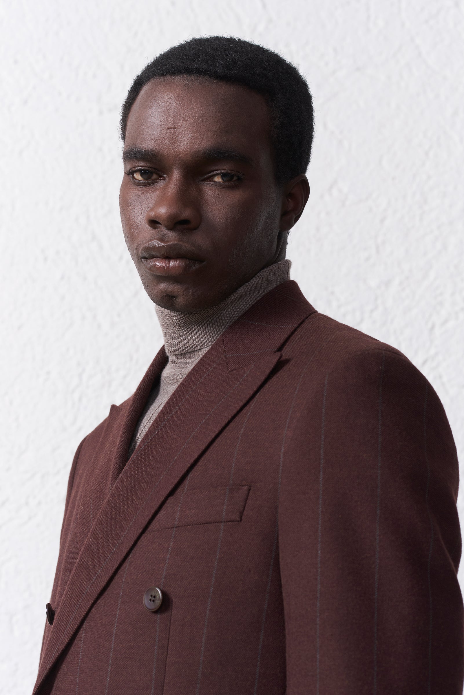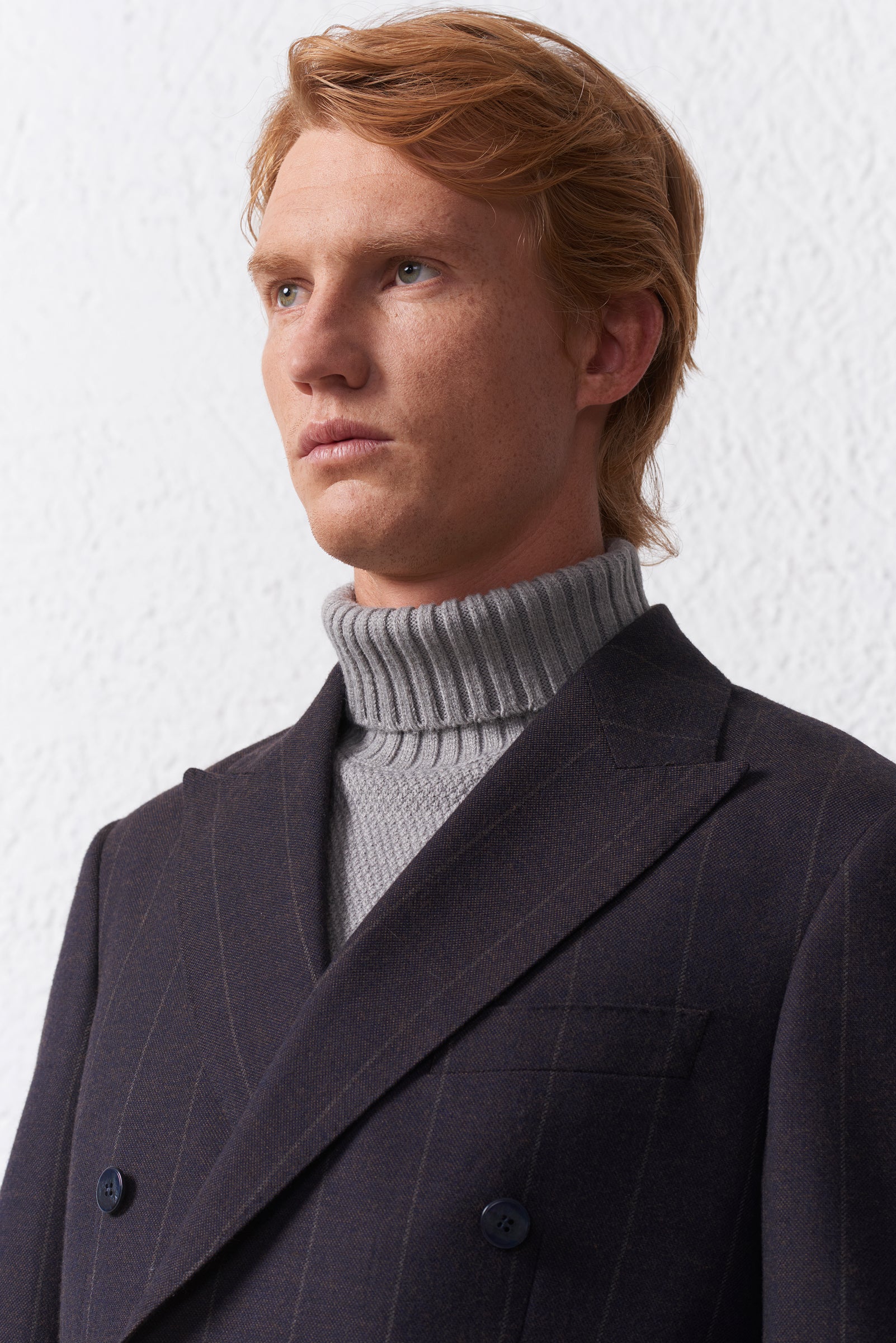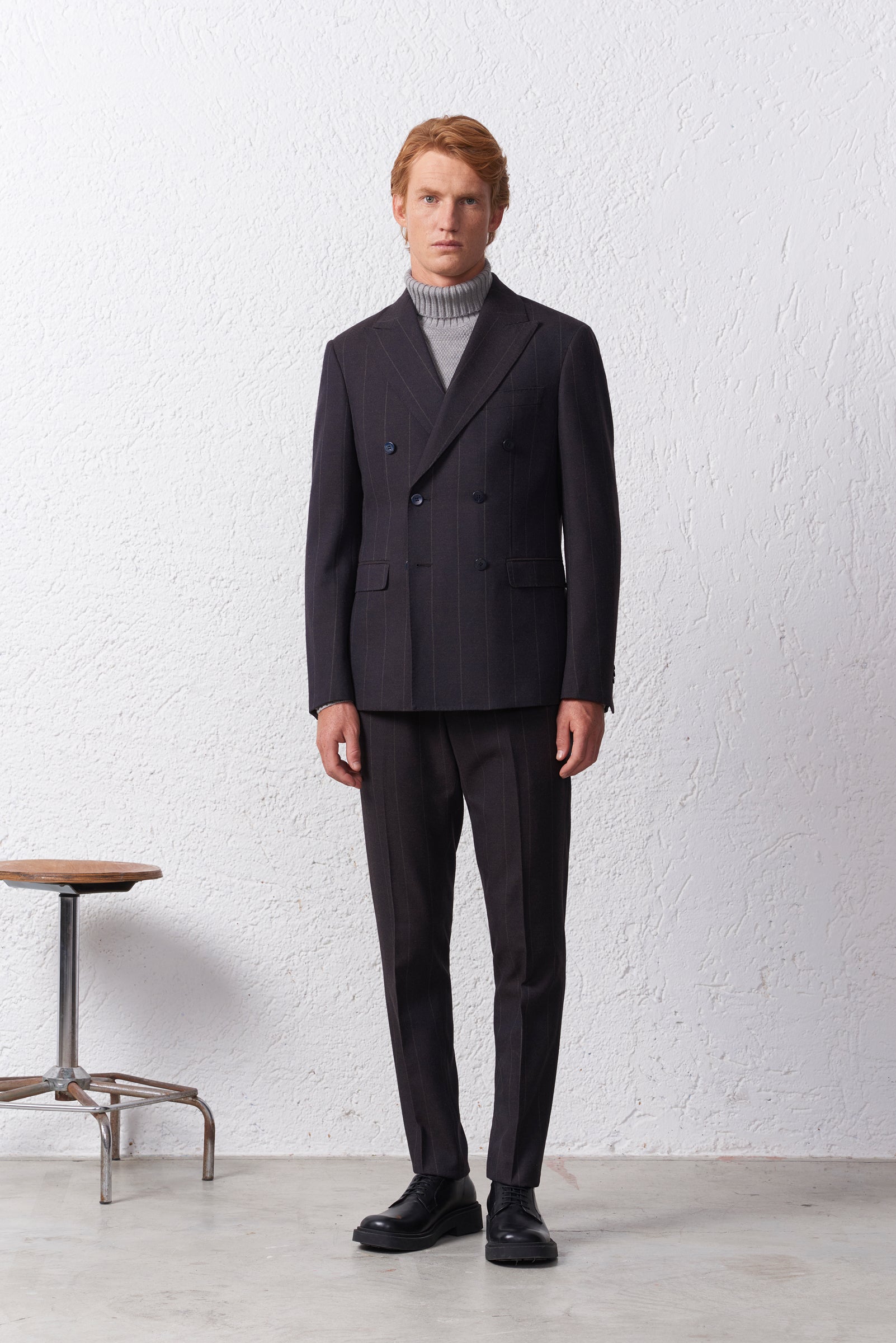 Abito uomo doppiopetto elegante disponibile nei colori blu e vinaccio, progettato per unire costruzione sartoriale a dettagli di stile attuale. Il modello si caratterizza per il petto a lancia deciso e proporzionato, che valorizza la linea delle spalle e dona un’allure contemporanea. Il tessuto tramato a diagonale crea un raffinato effetto ottico e una texture ricercata, perfetta per distinguersi con discrezione. Impunture visibili valorizzano bavero, tasche e taschino, enfatizzando la cura artigianale e la qualità del capo. La giacca è completata da due file di bottoni, tasche a pattina e taschino sul petto, mentre il pantalone mantiene una linea essenziale e moderna. L’abito risulta leggero, comodo e ideale per eventi formali o il business contemporaneo.Ideale con camicia bianca e cravatta tono su tono per le occasioni più sofisticate. Si abbina anche a maglie dolcevita in tinta neutra oppure camicie microfantasia per aggiornare il look in chiave più informale. Le versioni blu e vinaccio offrono versatilità per la stagione, valorizzabili con accessori classici come scarpe stringate o mocassini.