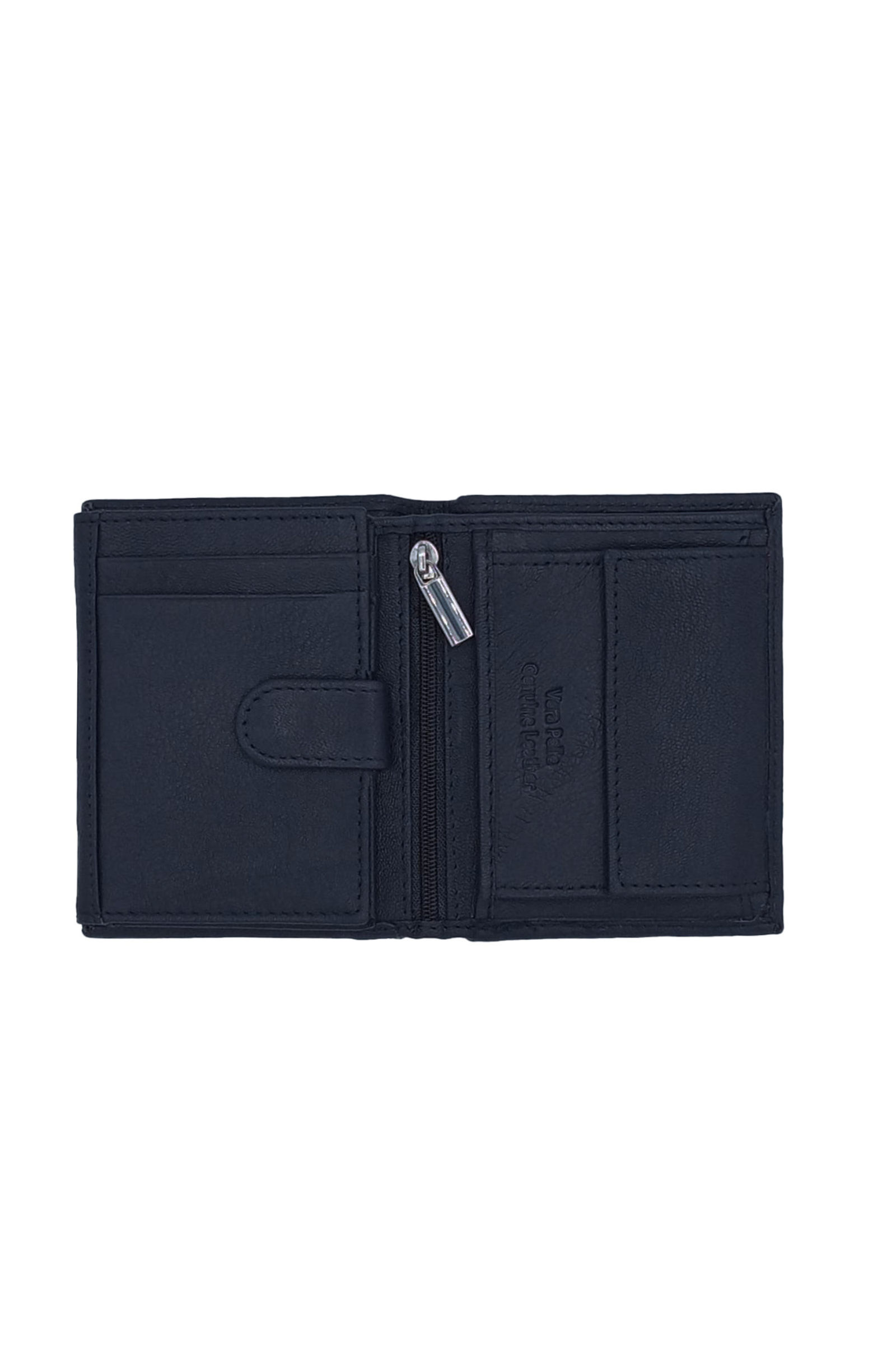 Portafoglio uomo in vera pelle blu, compatto e funzionale. 2 comparti, slot banconote, 7 carte totali, tasca zip. Dimensioni 9×11×2,5 cm. Codice ACC351.