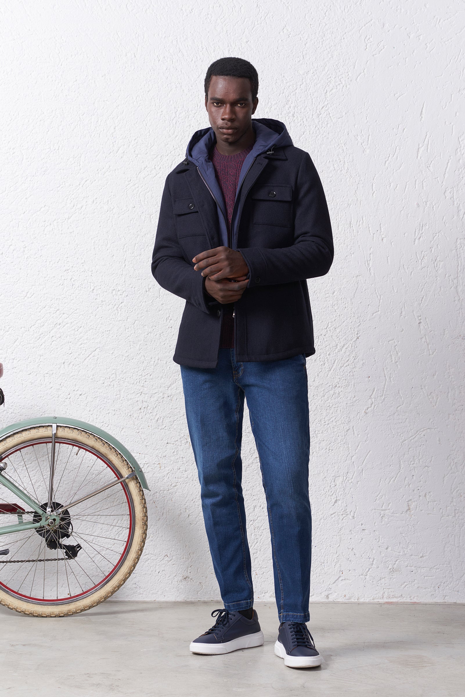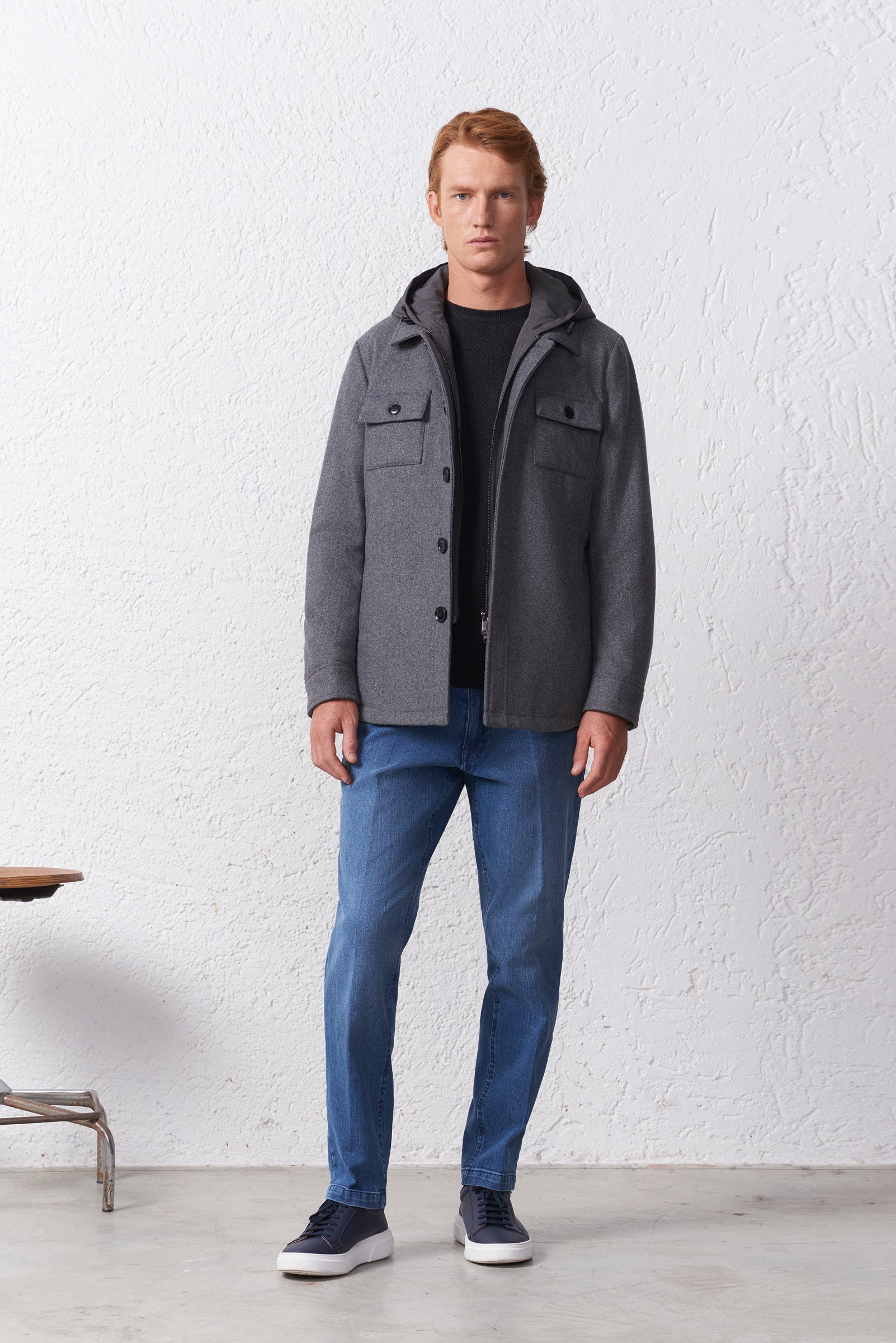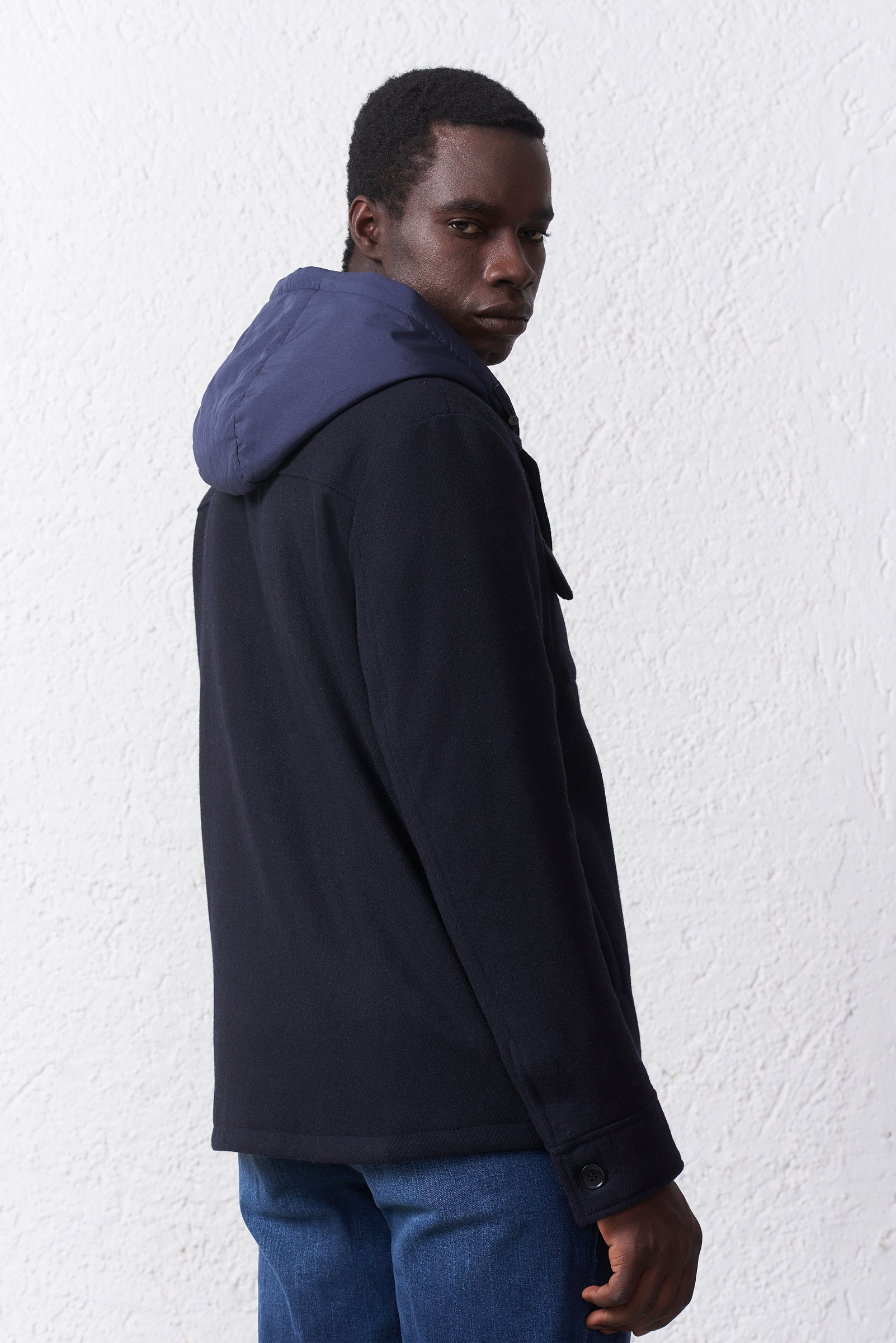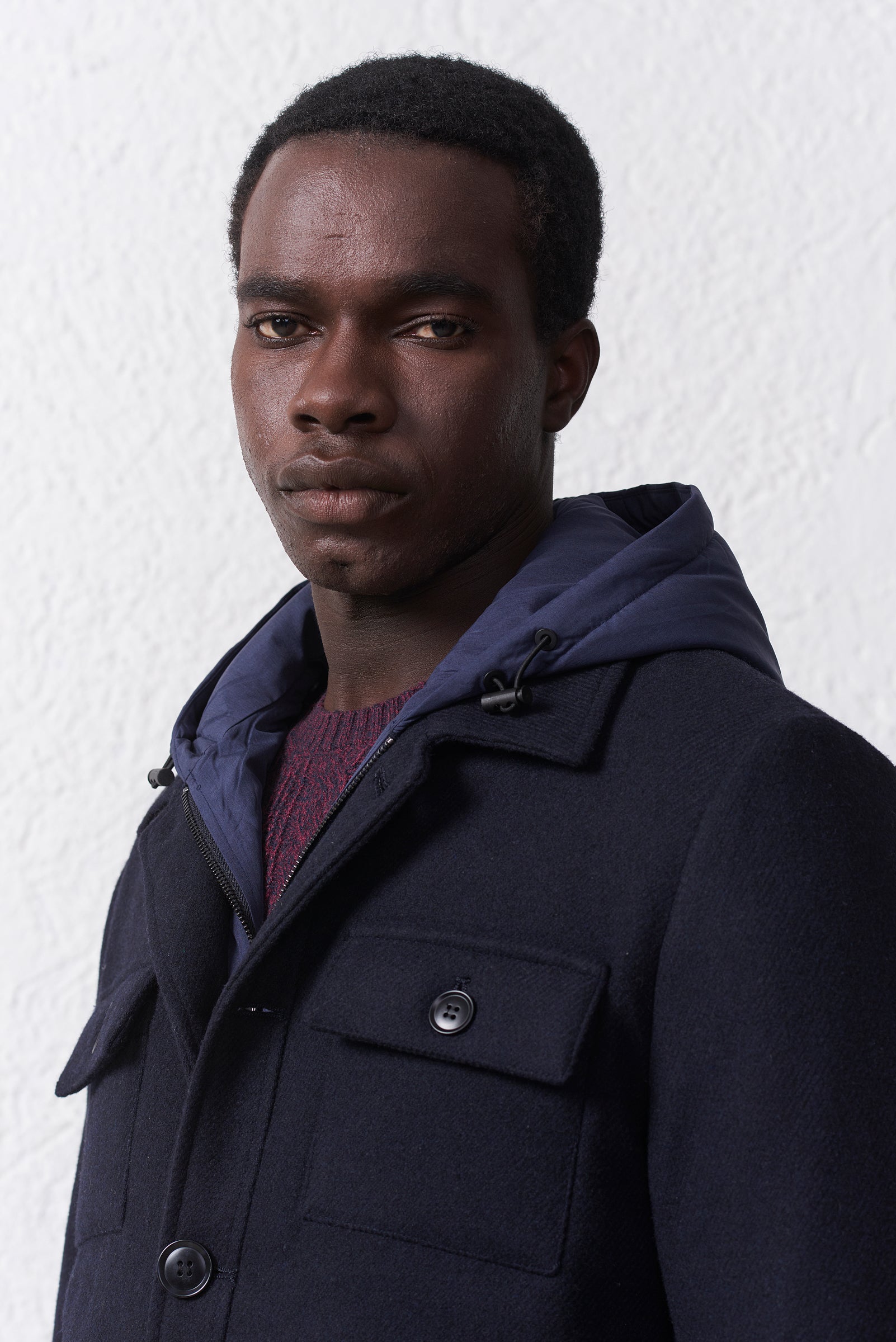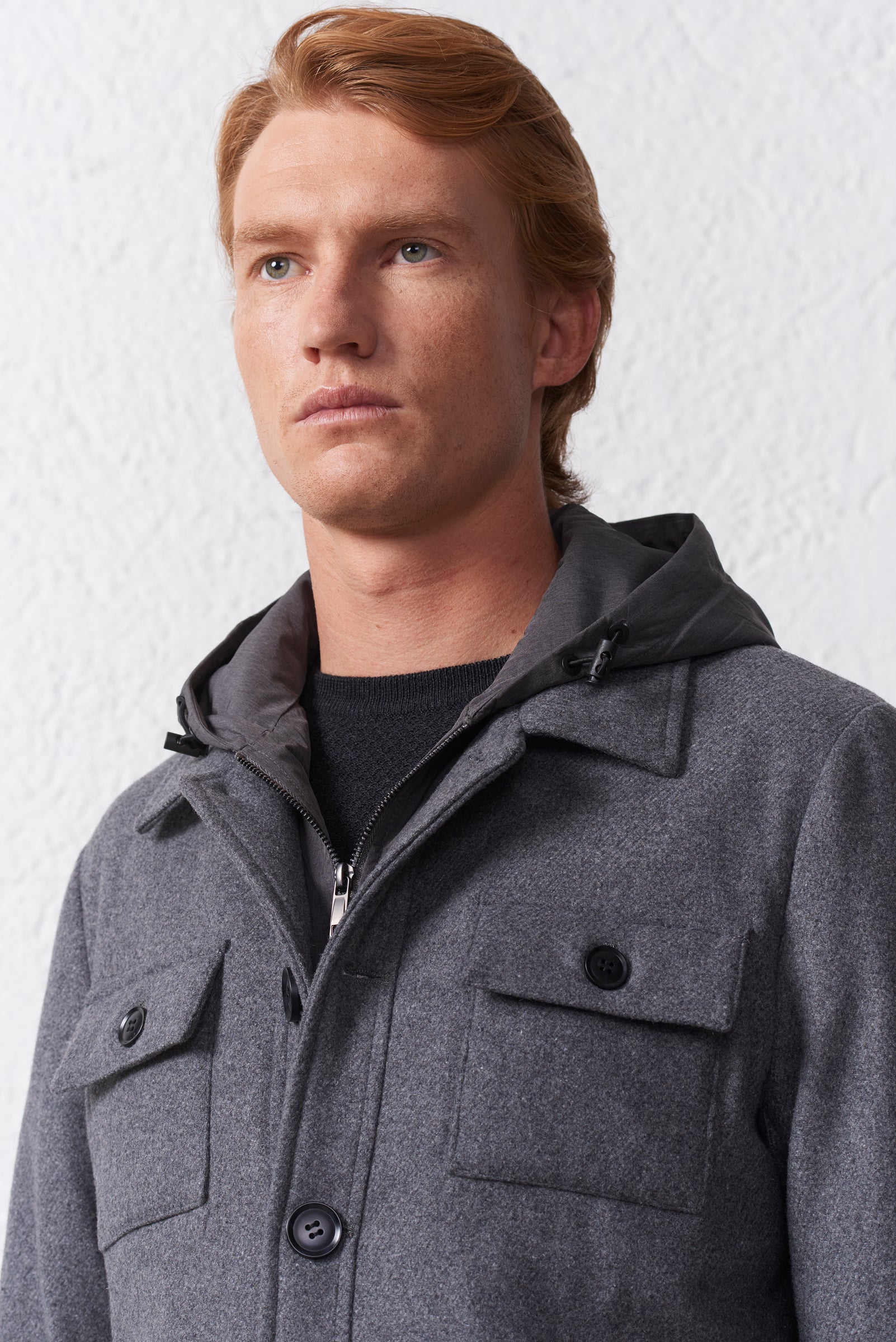 Cappotto uomo dal design moderno e funzionale, realizzato in tessuto misto lana per garantire calore, struttura ed eleganza urbana. Il capo è caratterizzato da una doppia chiusura frontale: zip coperta e bottoni a vista, che assicurano una perfetta protezione dal freddo e una vestibilità regolabile in base alle condizioni climatiche. Il cappuccio imbottito e removibile, fissato tramite bottoni a pressione e zip, aggiunge praticità e stile trasformando facilmente il cappotto da formale a casual in un attimo. Il capo è rifinito con tasche a pattina sul petto, tasche laterali verticali e polsini con bottoni, dettagli che arricchiscono la funzionalità senza rinunciare all’estetica. L’interno, curato nei dettagli, assicura ulteriore isolamento e comfort per l’inverno e la mezza stagione.