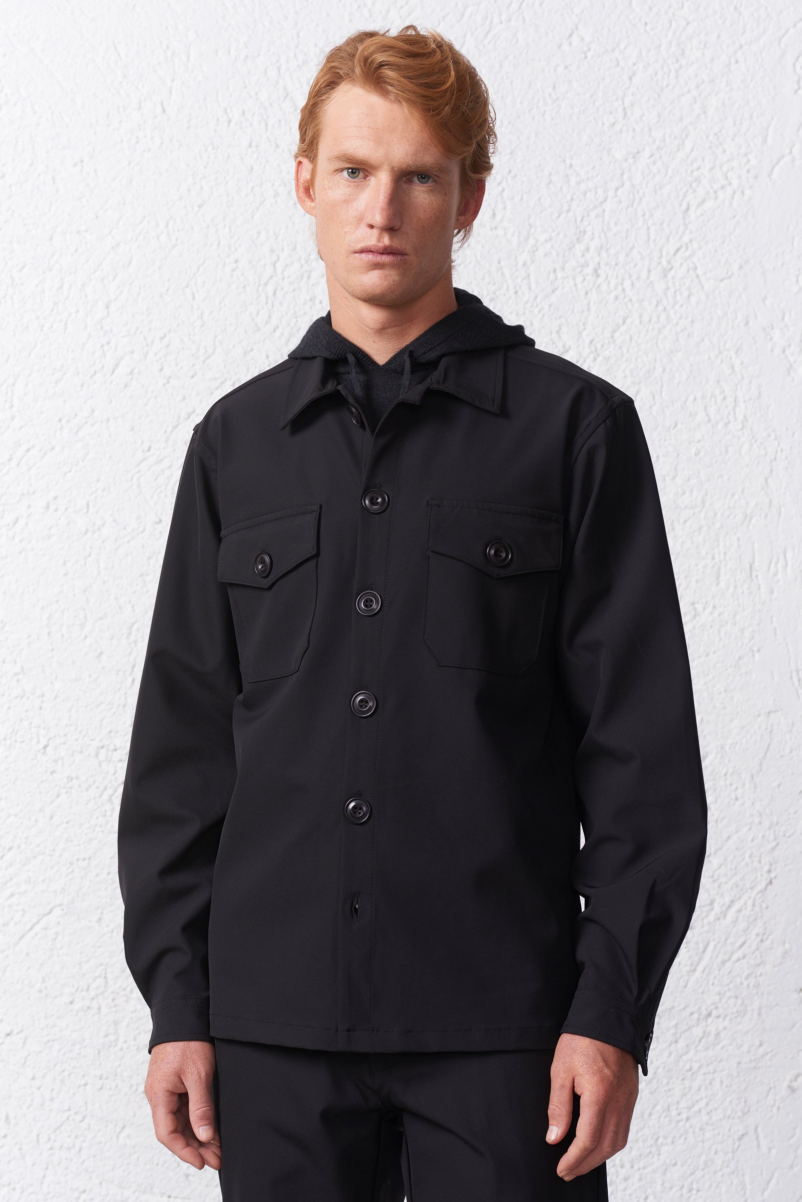 Overshirt uomo dal design contemporaneo realizzata in tessuto tecnico stretch, pensata per offrire leggerezza, elasticità e grande comfort in ogni occasione. Il modello presenta una linea pulita con chiusura frontale a bottoni, due tasche con pattina e bottone applicate sul petto per un tocco utility, polsi regolabili e colletto classico. Perfetta da indossare sia come giacca leggera durante le mezze stagioni sia come strato intermedio sotto cappotti o piumini durante i mesi più freddi. La vestibilità regolare e la costruzione stretch assicurano libertà di movimento e una sensazione confortevole, mentre le varianti colore blu e nero garantiscono versatilità ed eleganza in ogni abbinamento.