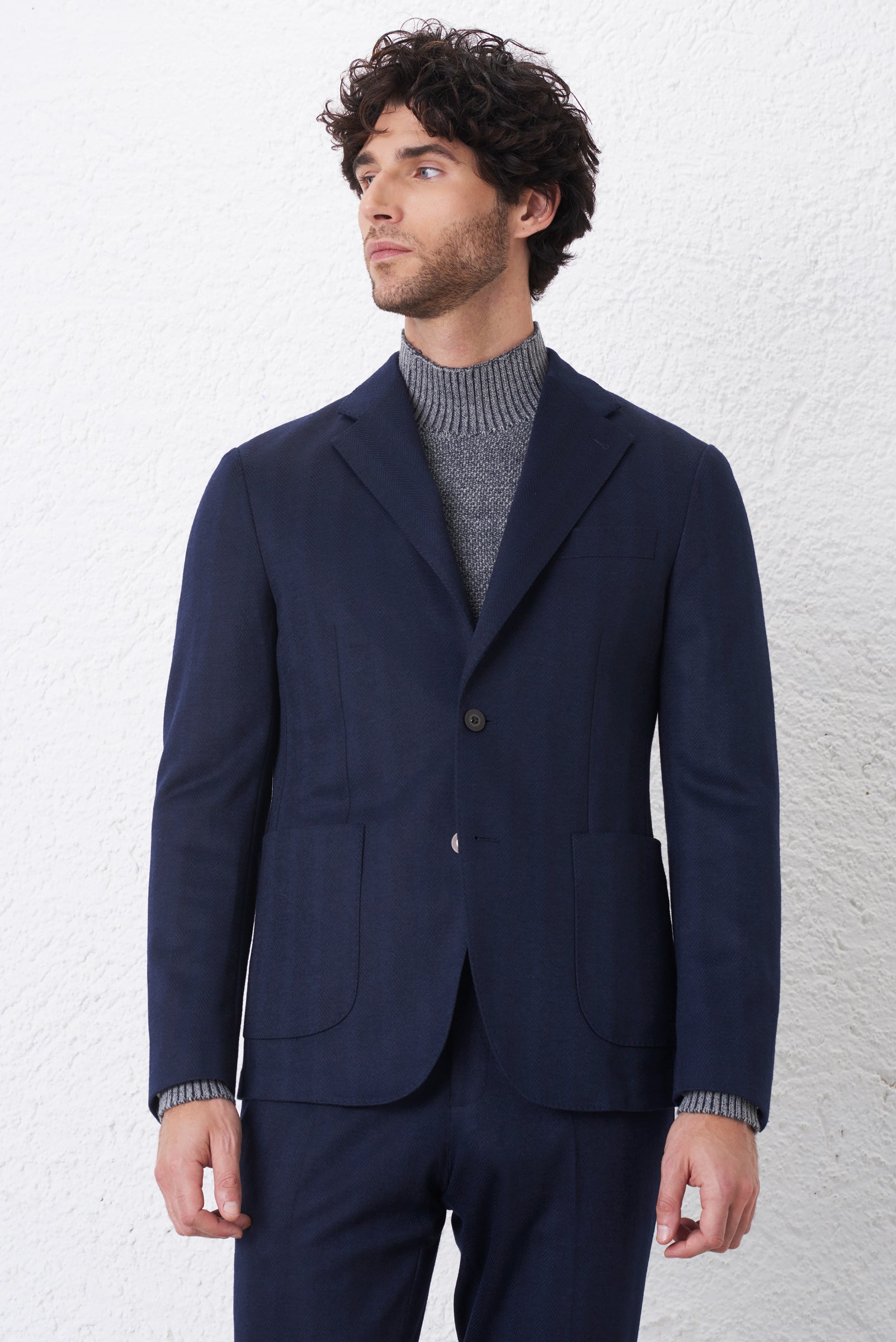 La giacca blu spigata è un capo elegante e dal carattere distintivo, realizzato con accurata trama spigata che valorizza la profondità cromatica del blu. Il modello propone un ampio bavero da 10 cm, doppio spacco posteriore e costruzione decostruita con cuciture alla francese, offrendo una vestibilità regular fit moderna e confortevole. Completamente sfoderata, la giacca integra tasche applicate sul fondo, taschino al petto con friso e taschino interno, arricchiti da dettagli sartoriali "mf" che delineano il perimetro del bavero, delle tasche e del taschino. Il tessuto di pregio è composto da 27% lana, 12% cotone e 67% poliestere, garantendo equilibrio fra eleganza, praticità e durata. Perfetta in abbinamento al pantalone PA587 per un look formale e sofisticato, questa giacca rappresenta la scelta ideale per chi valorizza stile e attenzione ai dettagli negli ambienti professionali e in occasioni speciali.