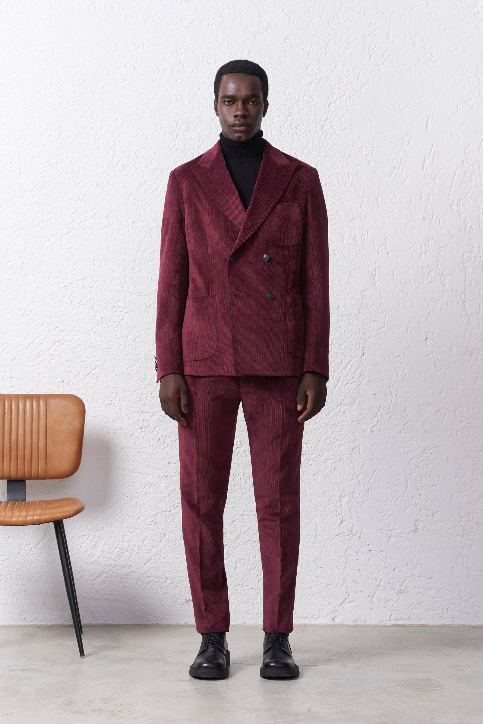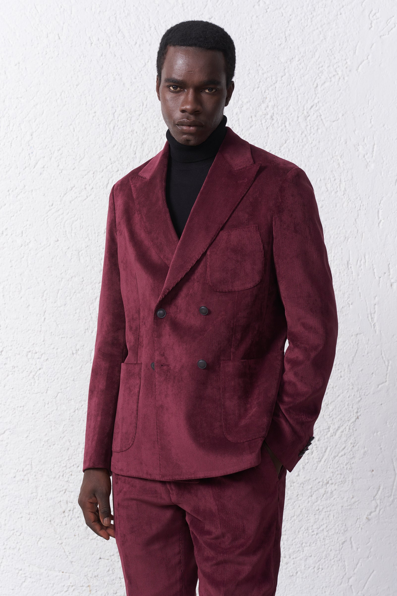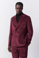 Giacca doppiopetto uomo in velluto, petto a lancia e bavero 10cm, impuntura sartoriale. Completa il look con il pantalone PA594 abbinato.