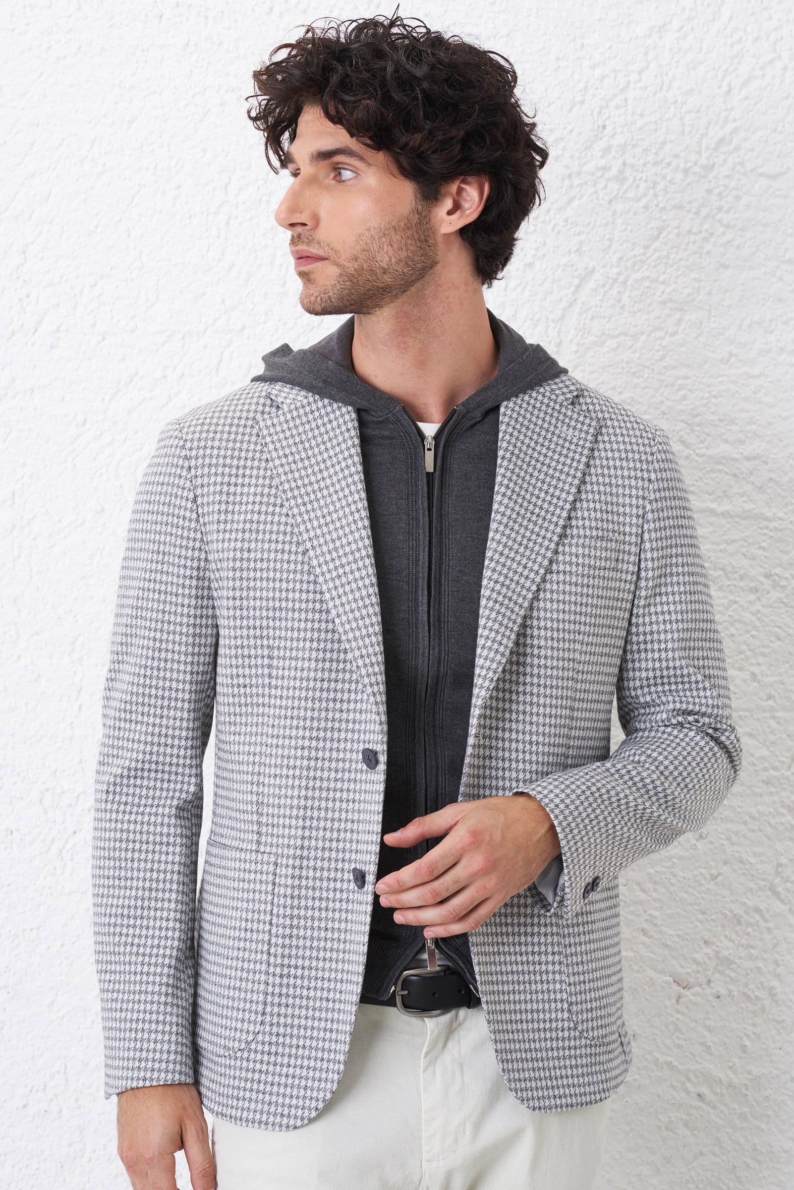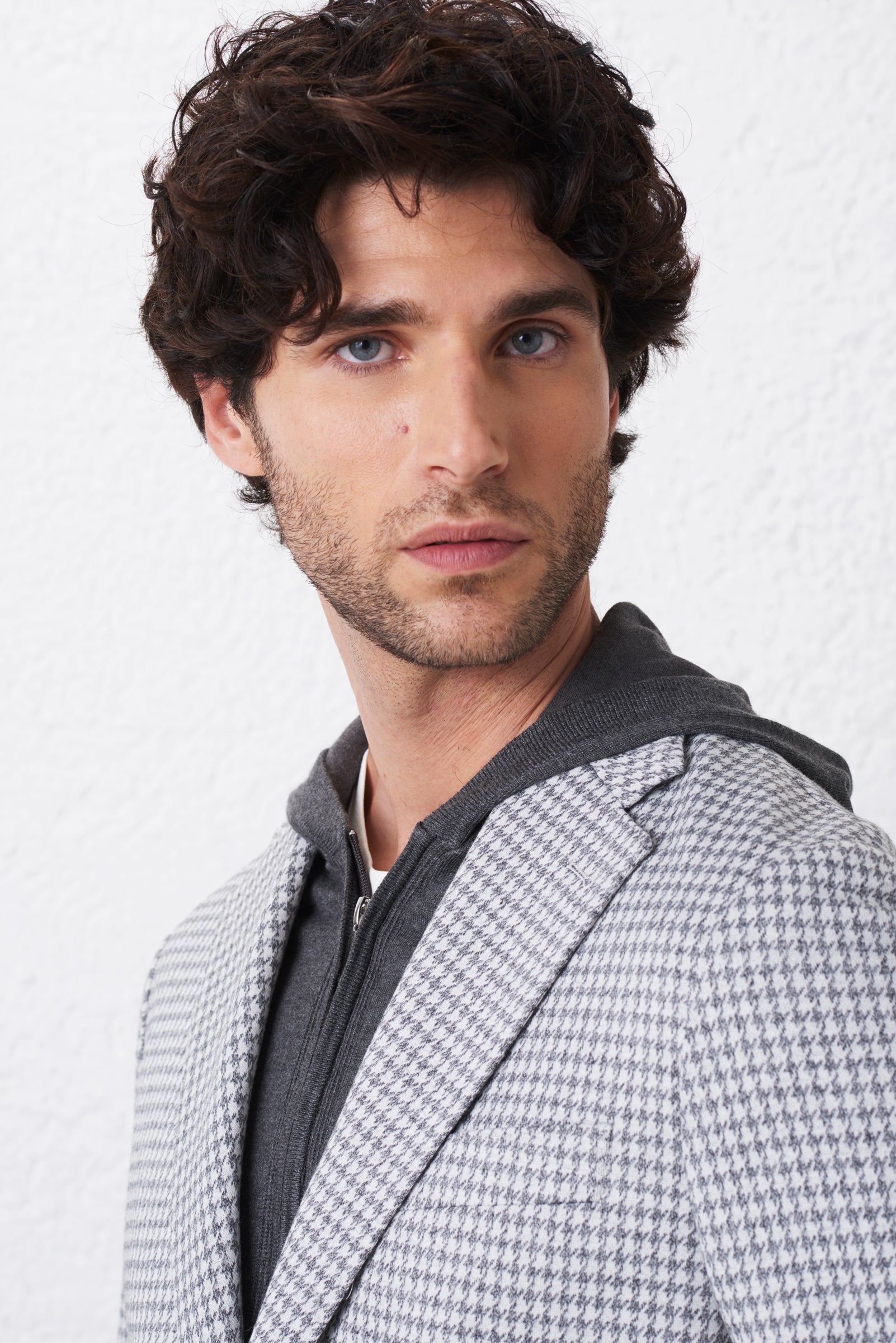 La giacca monopetto G292 in maglia, proposta nella classica lavorazione pied de poule, unisce tradizione sartoriale a comfort e versatilità. Costruita in stile decostruito, sfoderata e con cuciture alla francese, garantisce una vestibilità regular fit moderna ed elegante. Il bavero di 10 cm conferisce un tocco formale, completato da doppio spacco posteriore, due ampie tasche a toppa e taschino al petto con friso, oltre a pratico taschino interno. Le rifiniture sartoriali “mf” valorizzano ogni dettaglio del capo. Il colore grigio rende la giacca facilmente abbinabile, ideale per occasioni professionali e look urbani di tendenza.