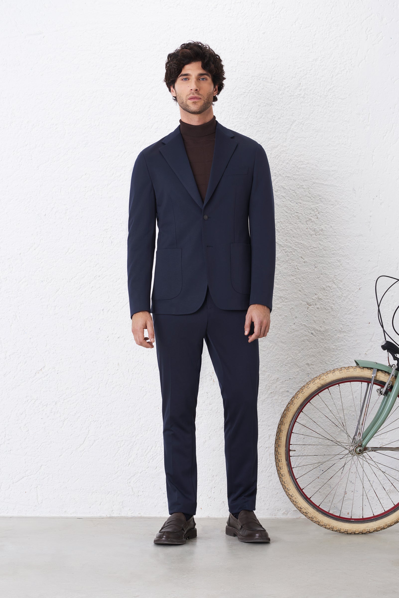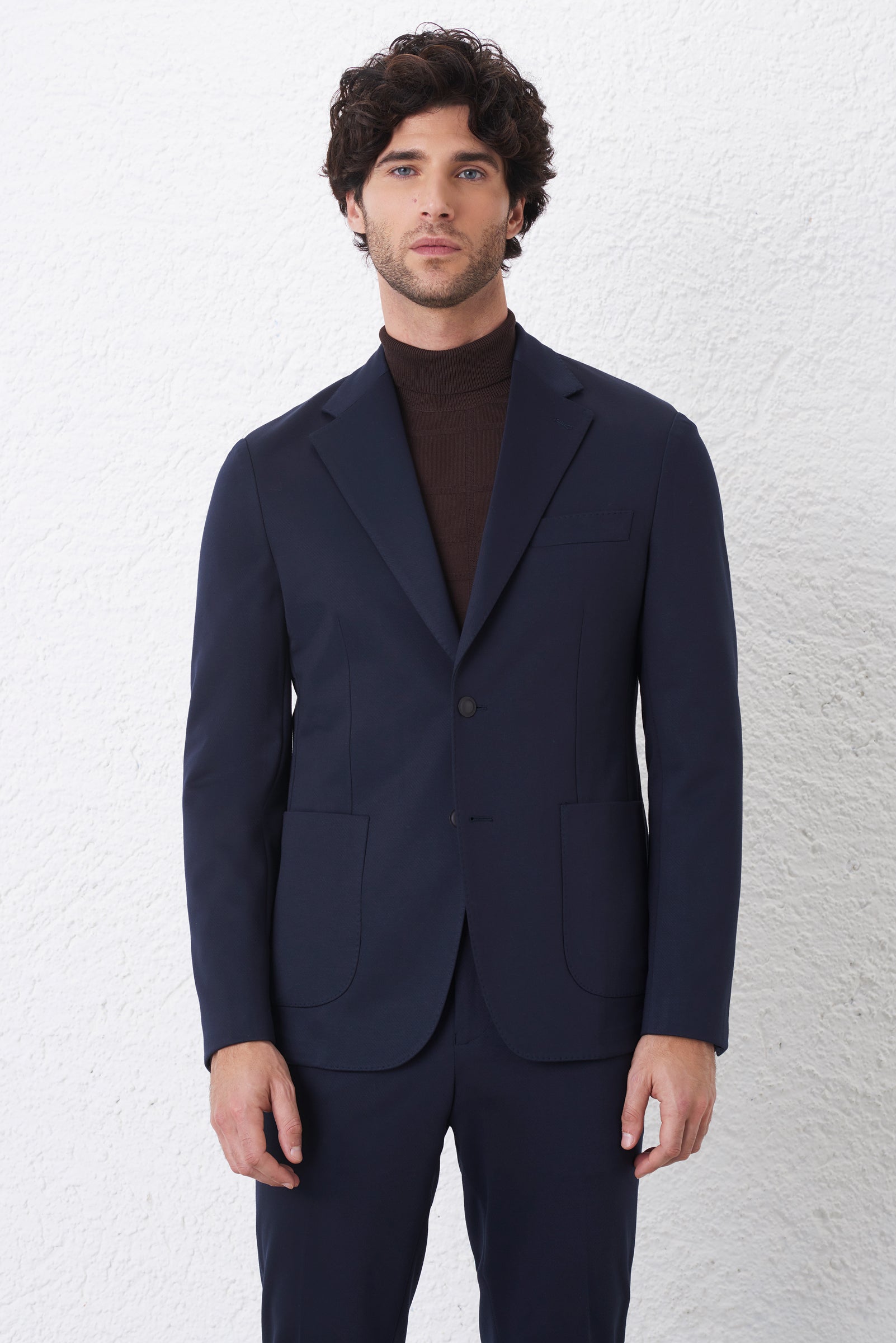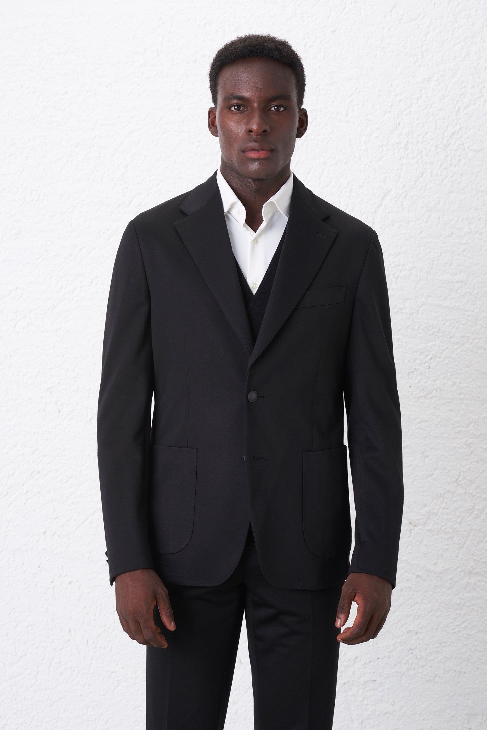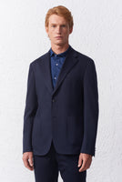Giacca monopetto regular fit in tessuto tecnico misto, bavero da 10 cm, blu o nero. Dettagli sartoriali e comfort formale per ogni occasione.