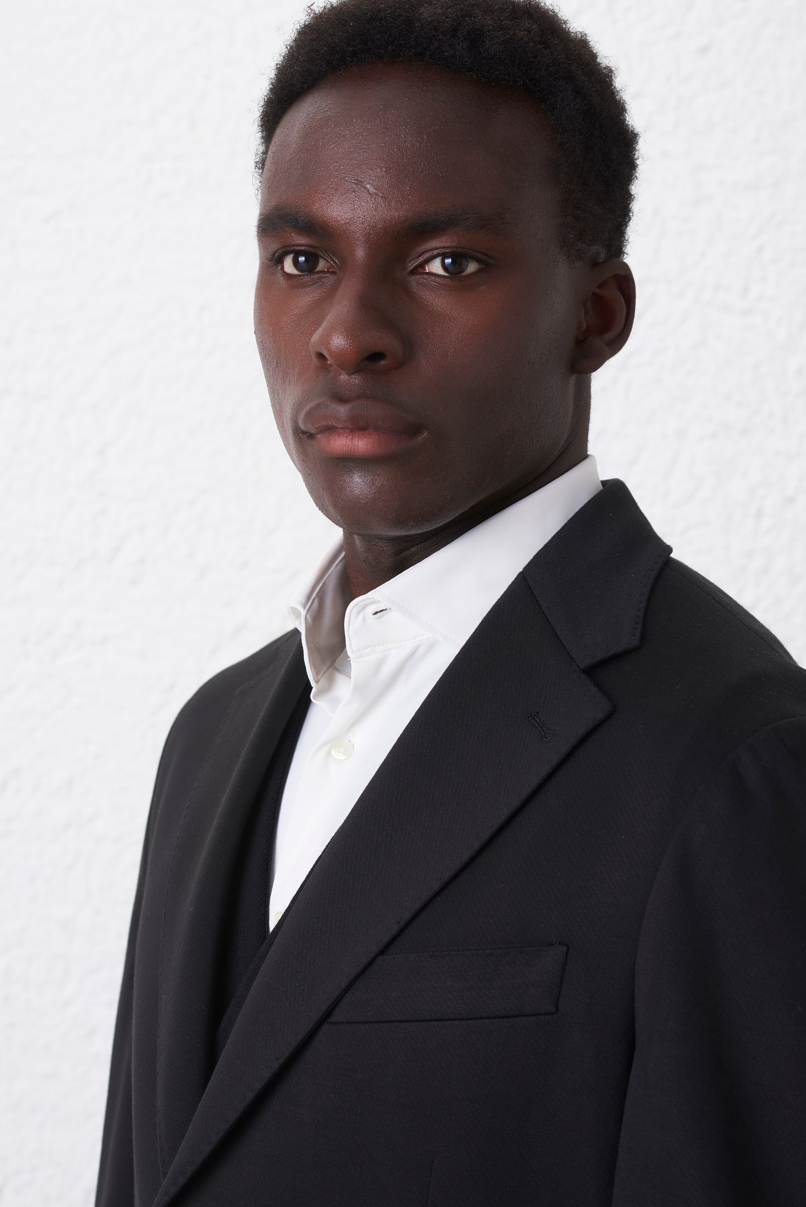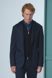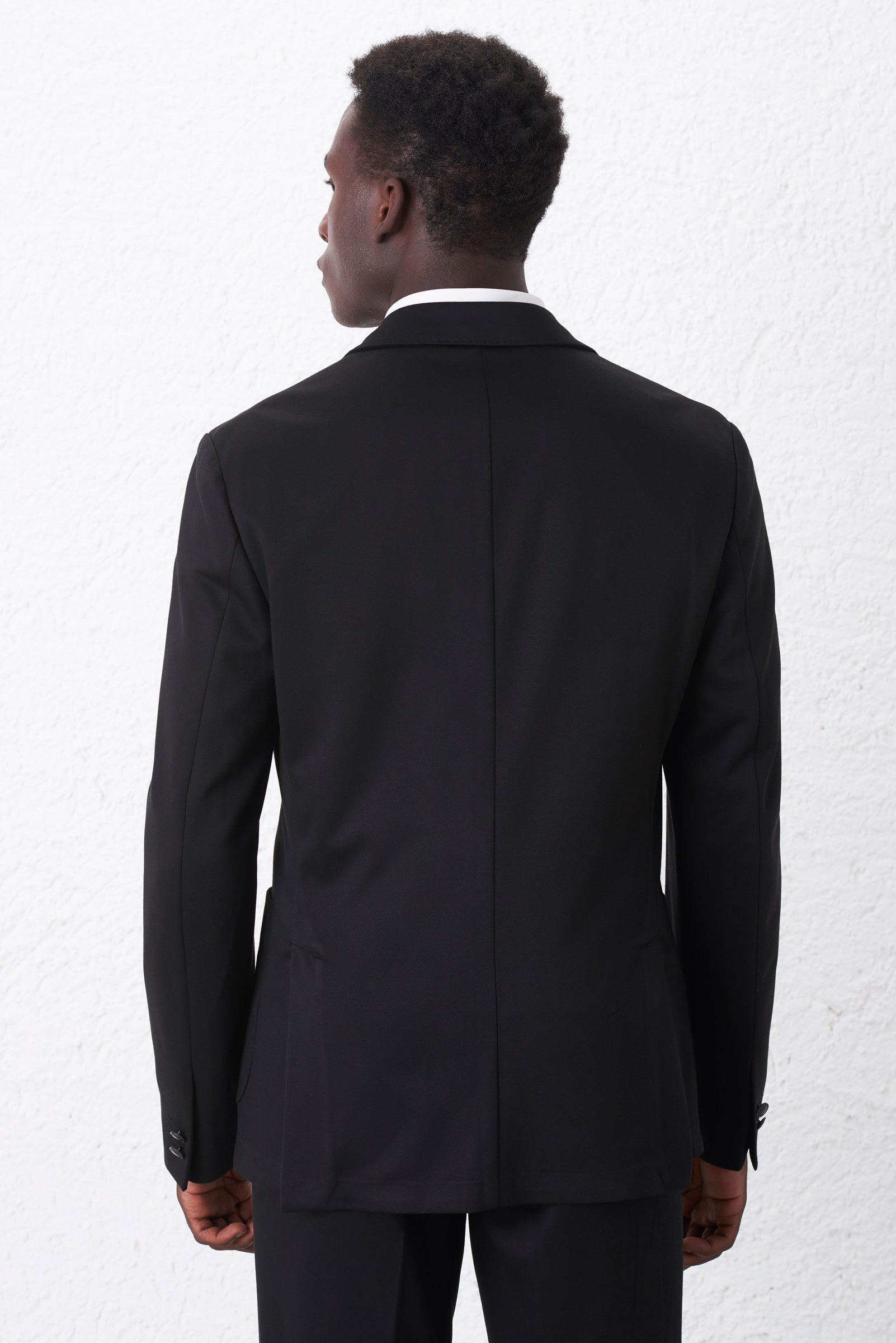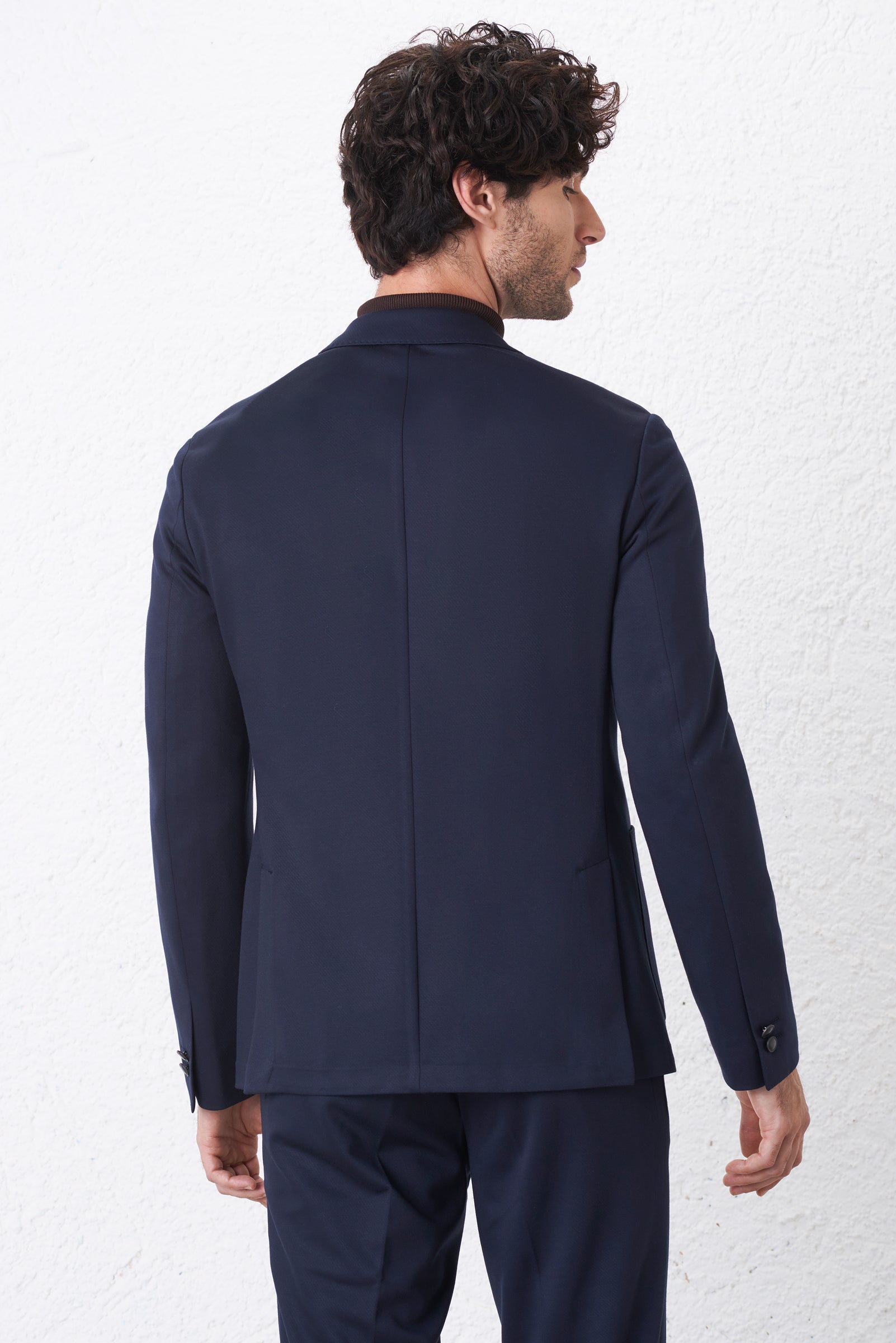 Giacca monopetto regular fit in tessuto tecnico misto, bavero da 10 cm, blu o nero. Dettagli sartoriali e comfort formale per ogni occasione.