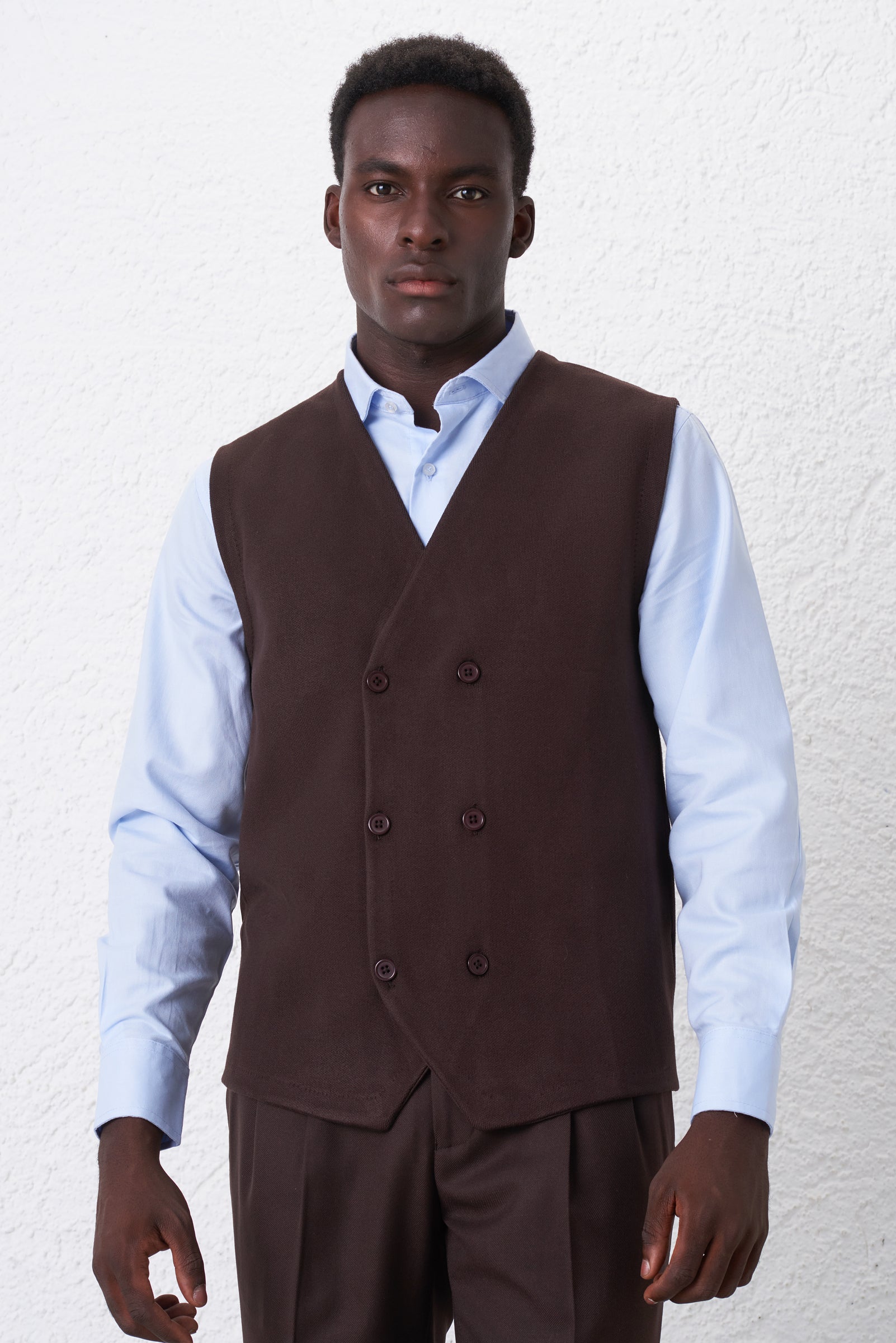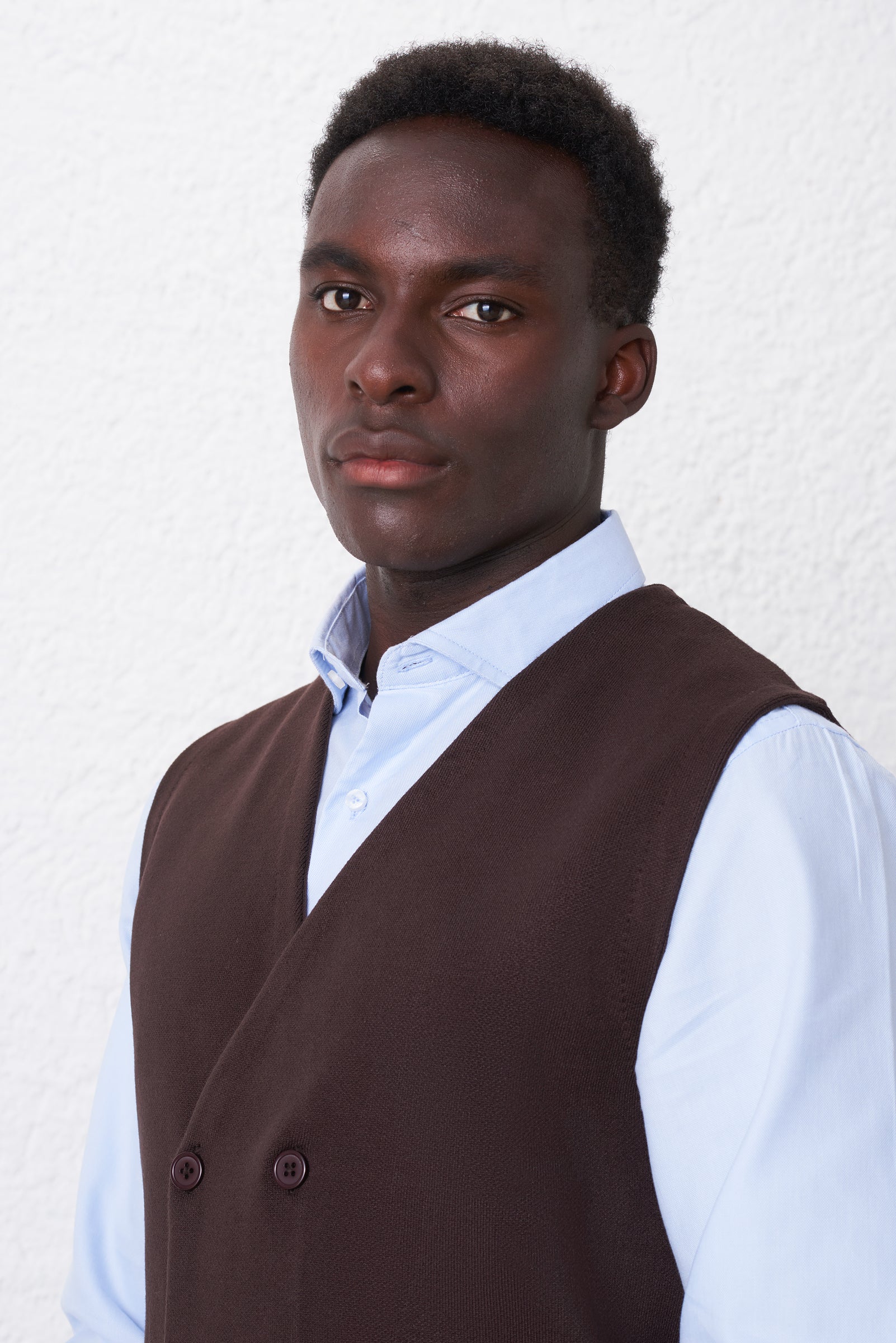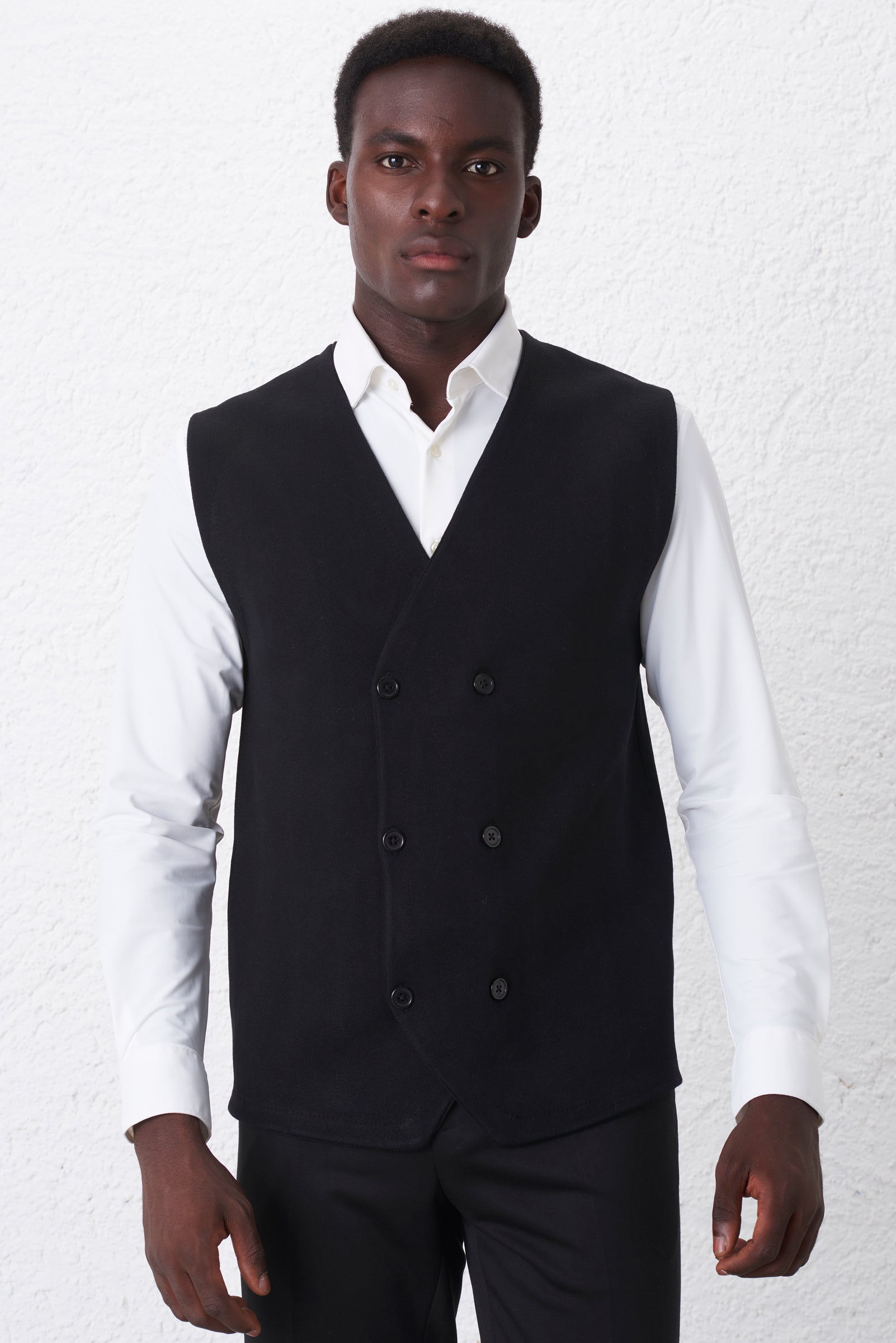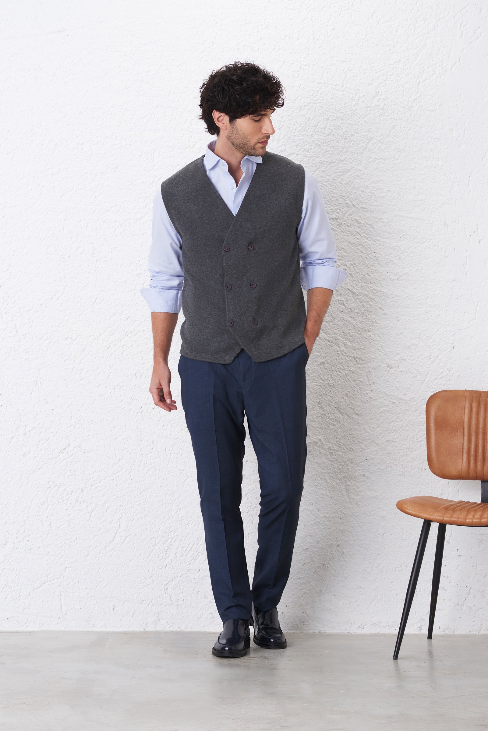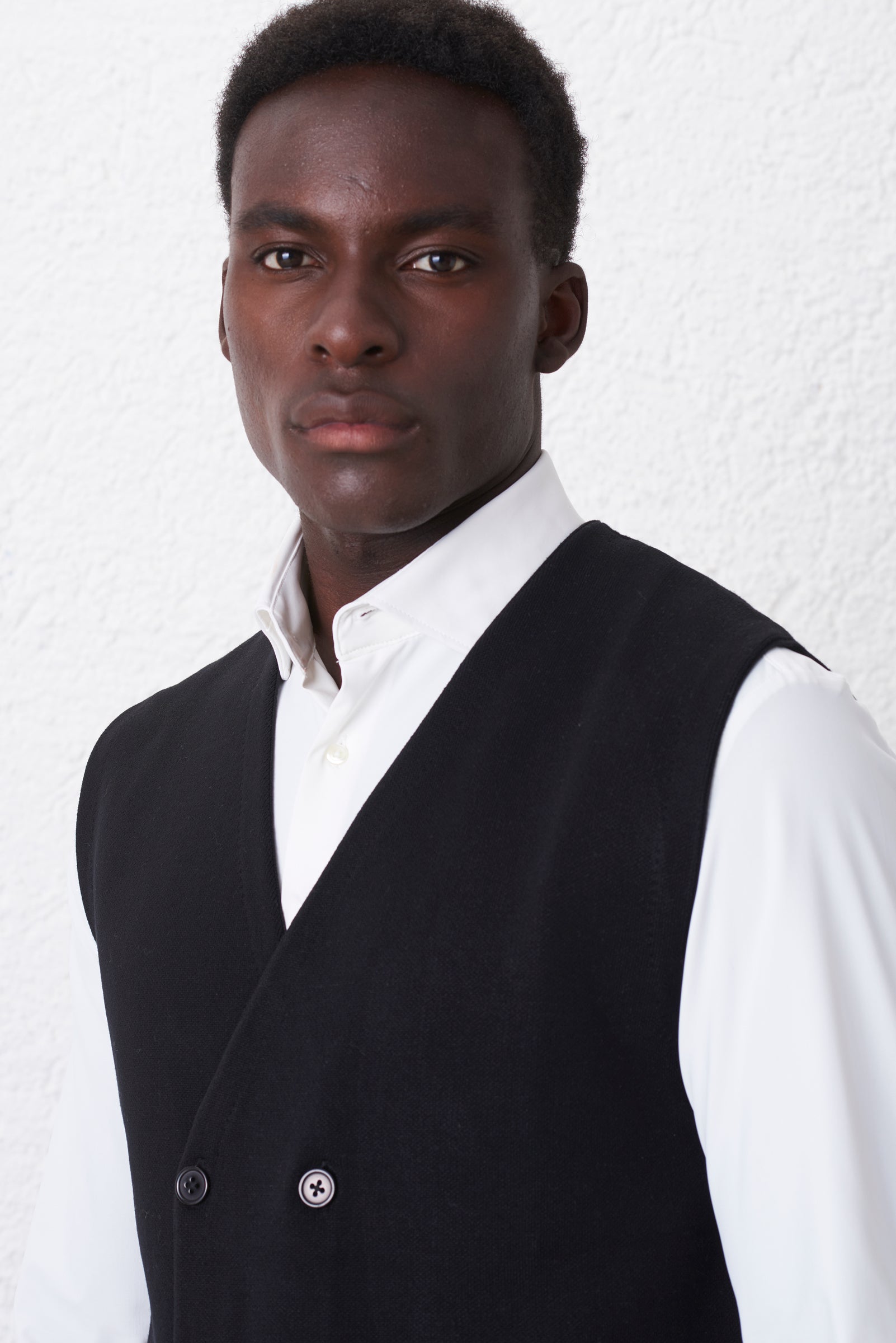 Il gilet doppiopetto presentato è realizzato in maglieria di misto viscosa interamente calata, una particolare tecnica che consente di ottenere una struttura resistente, indeformabile e con rifiniture estremamente pulite. La calatura, applicata alla trama chicco di riso, dona eleganza, ordine nelle linee e una mano morbida ma strutturata. Il design doppiopetto assicura un twist sartoriale contemporaneo, rifinito dalla bordatura precisa e dai bottoni che arricchiscono il capo. Disponibile in blu notte, antracite, nero e moro, questo gilet rappresenta una scelta ideale sia per look formali sotto la giacca sia per valorizzare outfit più casual con uno stile raffinato e moderno.