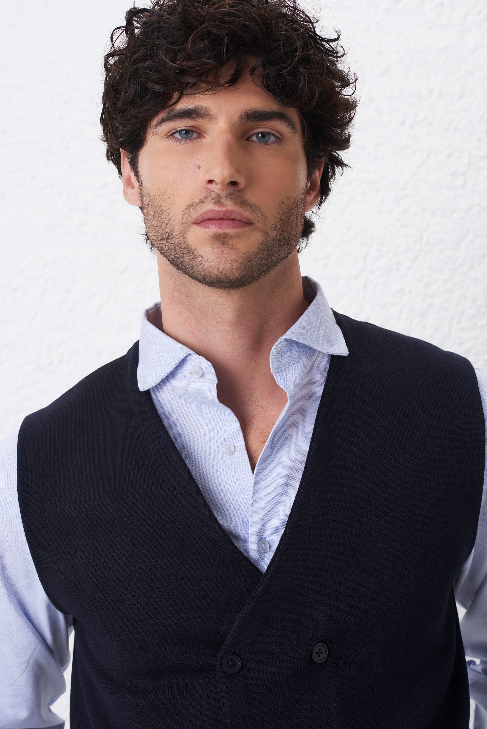 Gilet doppiopetto in maglia calata misto viscosa, chicco di riso. Colori blu notte, antracite, nero, moro. Resistente, elegante e moderno.