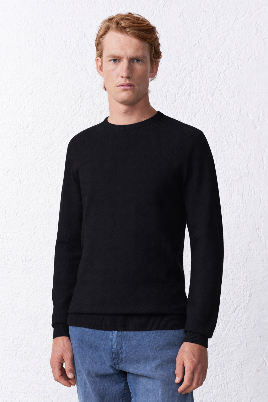 Maglia girocollo uomo in misto viscosa, lavorata secondo la tecnica della calatura che garantisce resistenza e una rifinitura sartoriale impeccabile. L'articolo si distingue per la trama tono su tono, dal sofisticato motivo a spina di pesce, che dona profondità e personalità al capo senza eccessi. Il tessuto misto viscosa assicura leggerezza, piacevole elasticità e comfort prolungato, ideale sia per look business che smart casual. Lavorazione con costine 1/1 su polsi, fondo e girocollo per stabilità e vestibilità perfetta. Disponibile nei classici colori blu, panna e verde, è pensata per inserirsi con facilità nei guardaroba contemporanei.