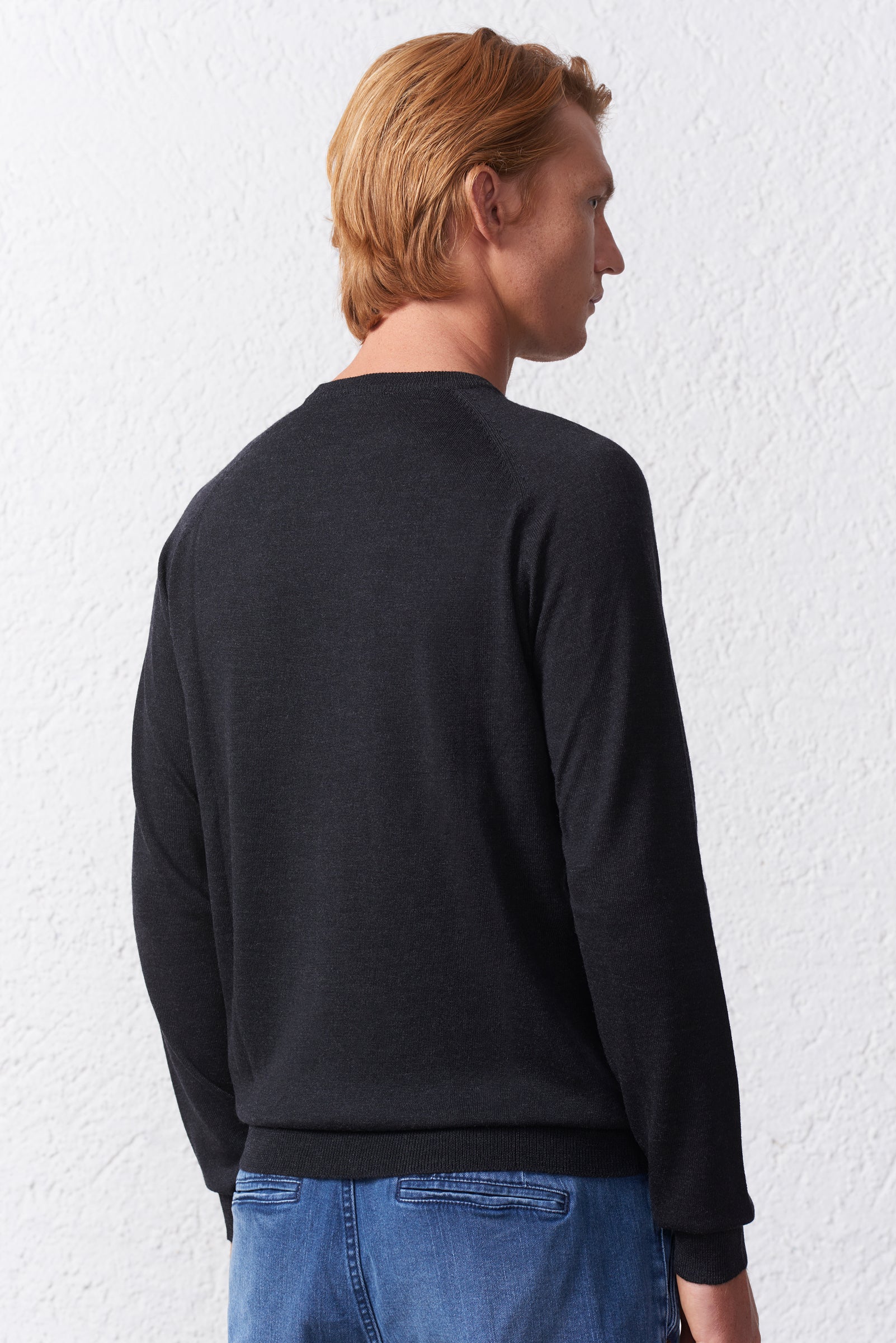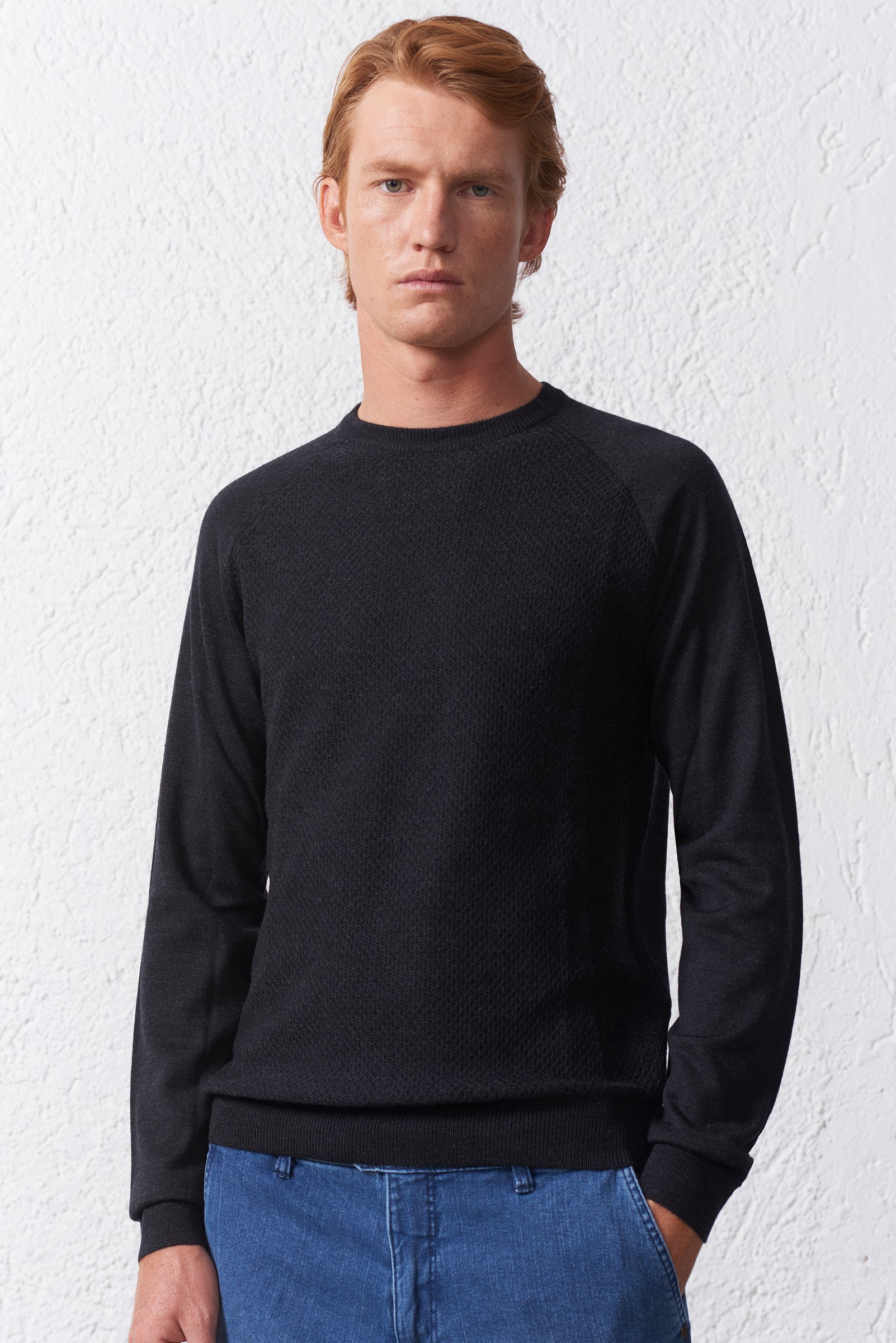 Maglia girocollo uomo realizzata in misto lana merinos, con una particolare lavorazione che differenzia la texture delle varie parti del capo. Il pannello frontale sfoggia una raffinata microtrama in rilievo, ottenuta grazie a una tecnica a maglia che aggiunge profondità e movimento visivo, mantenendo un aspetto elegante e sofisticato. Le spalle raglan e le maniche sono lisce e compatte, creando un affascinante contrasto al tatto e alla vista e donando alla maglia un appeal moderno e pulito. Collo, polsi e fondo sono rifiniti in costina 1/1 per una migliore vestibilità e durata nel tempo. Il filato misto merinos assicura comfort termico, morbidezza sulla pelle e ideale traspirabilità per le mezze stagioni e l’inverno.