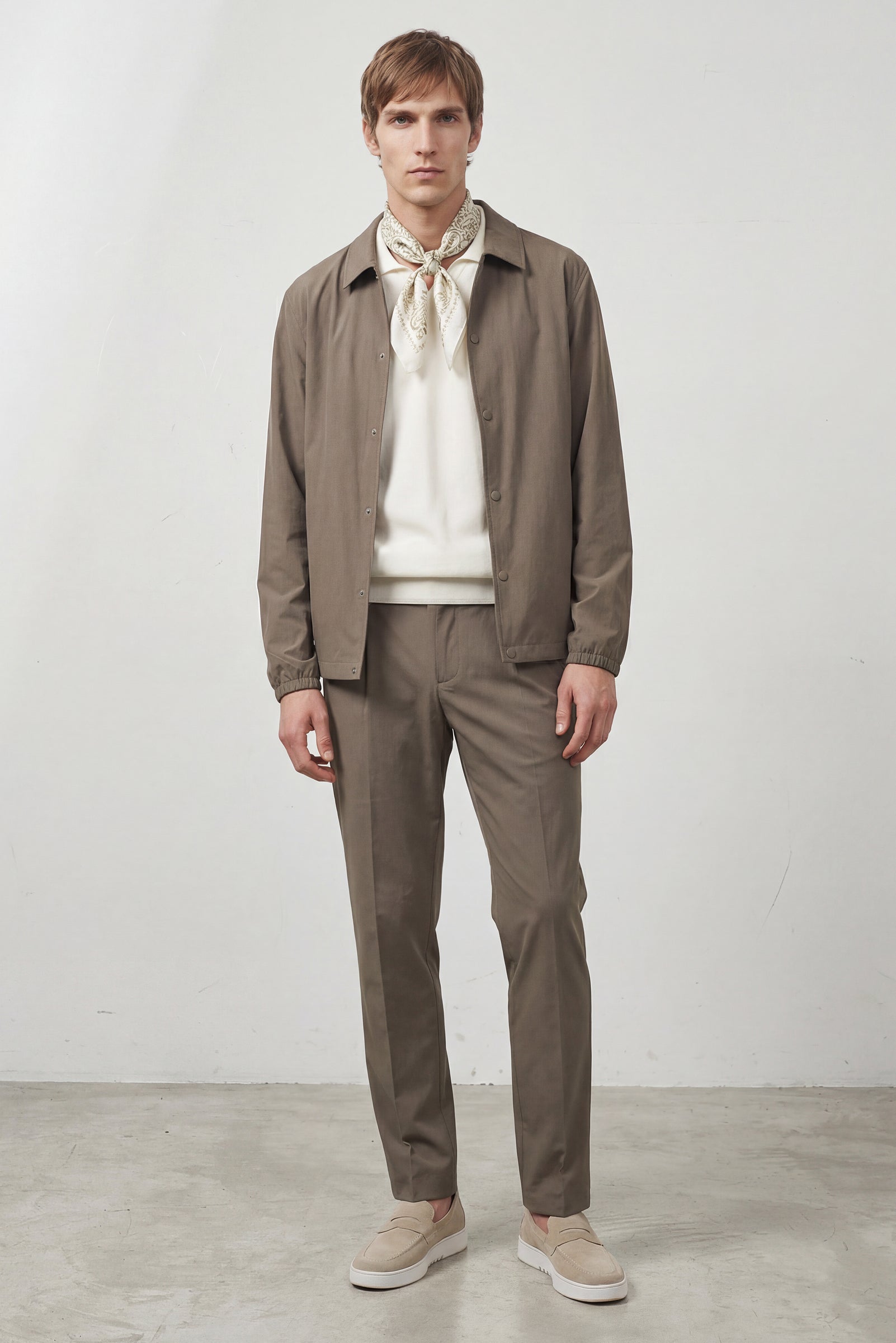 Il design si distingue per il suo approccio essenziale: collo camicia strutturato, chiusura frontale con bottoni a pressione (clip) e linee pulite che enfatizzano un’estetica sofisticata ma rilassata. Le maniche presentano polsini elasticizzati, dettaglio funzionale che introduce un leggero accento sportivo senza compromettere l’eleganza complessiva.