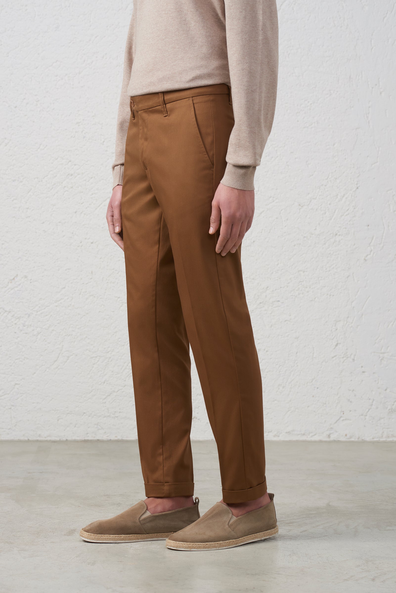 Questo pantalone interpreta in chiave contemporanea il classico tailoring maschile, puntando su una costruzione essenziale e una vestibilità impeccabile. La linea è asciutta e slanciata, pensata per valorizzare la figura con un fit slim che accompagna la gamba senza costringerla. Il punto vita è rifinito con cintura con passanti e chiusura con bottone, mantenendo un’estetica pulita e versatile, ideale sia per look formali che per abbinamenti più rilassati. L’assenza di pinces contribuisce a definire un profilo moderno e minimal, perfetto per chi ricerca un pantalone elegante ma dal carattere attuale. Le tasche laterali a filo si integrano con discrezione nel design, enfatizzando la pulizia delle linee, mentre la piega frontale dona struttura e continuità visiva lungo tutta la gamba. Il pantalone è completato da un fondo con risvolto, dettaglio che aggiunge un tocco sofisticato e contemporaneo, ideale per valorizzare calzature eleganti o casual chic. Un capo essenziale nel guardaroba maschile, capace di adattarsi con naturalezza a diversi contesti, mantenendo sempre un equilibrio perfetto tra eleganza e modernità.