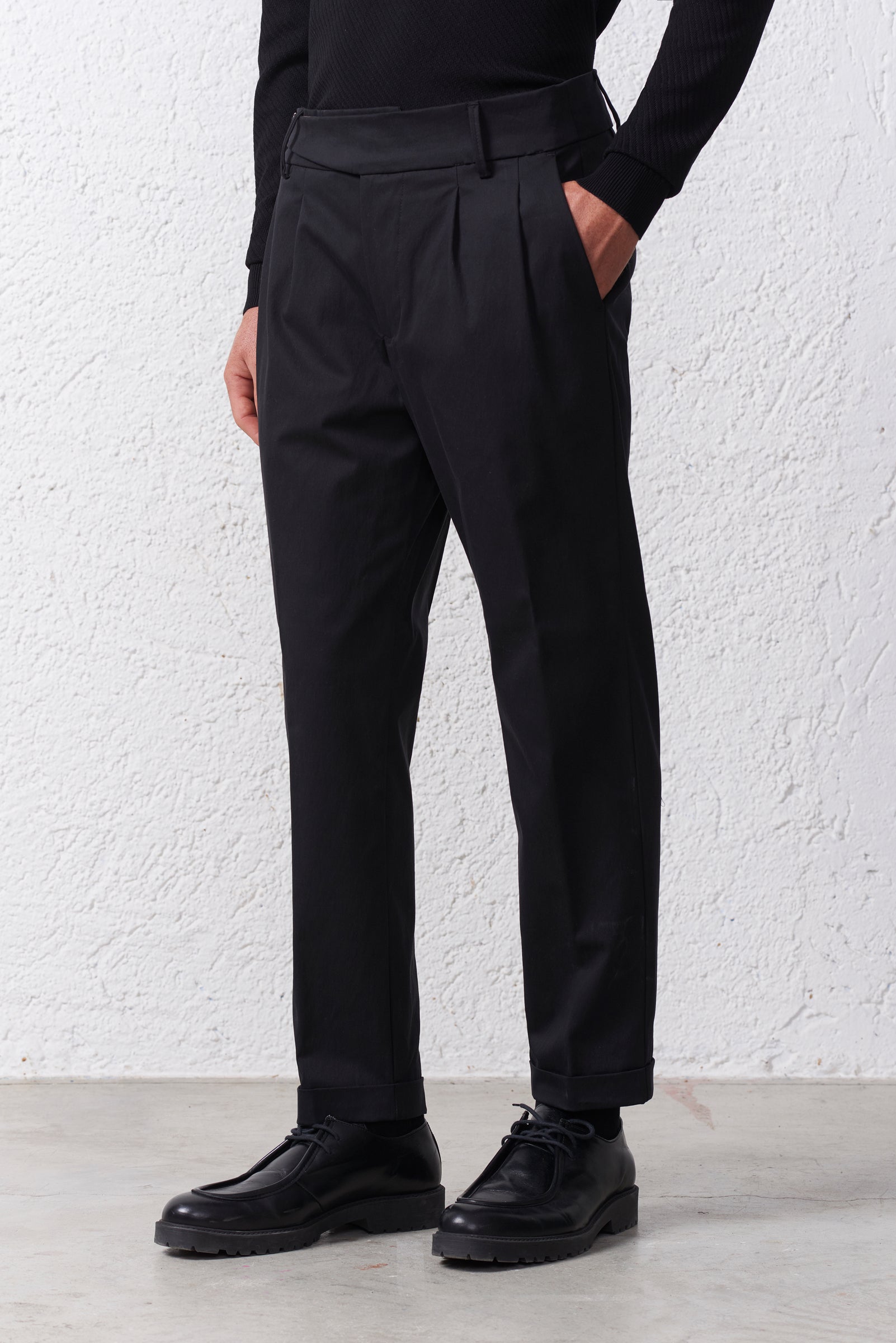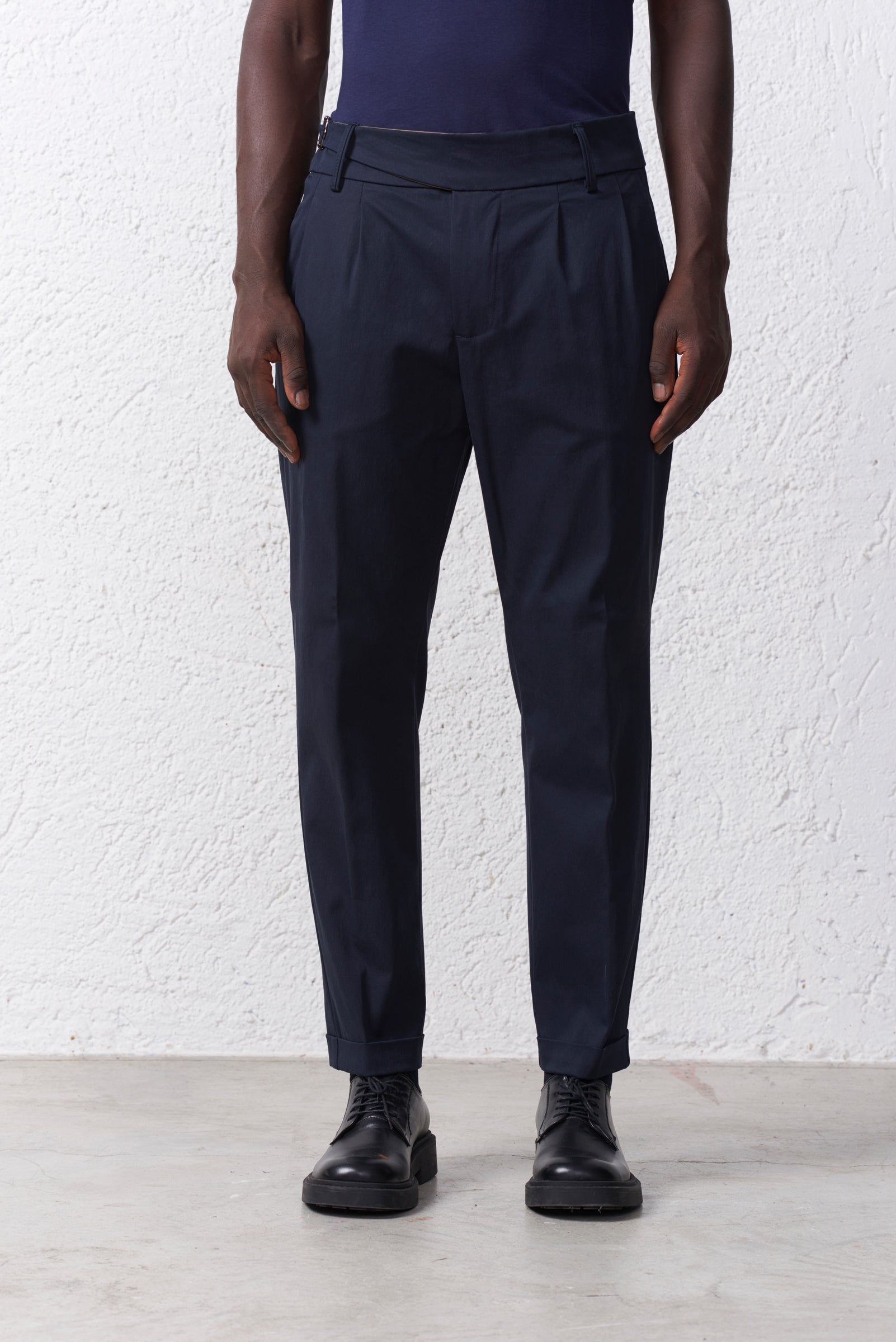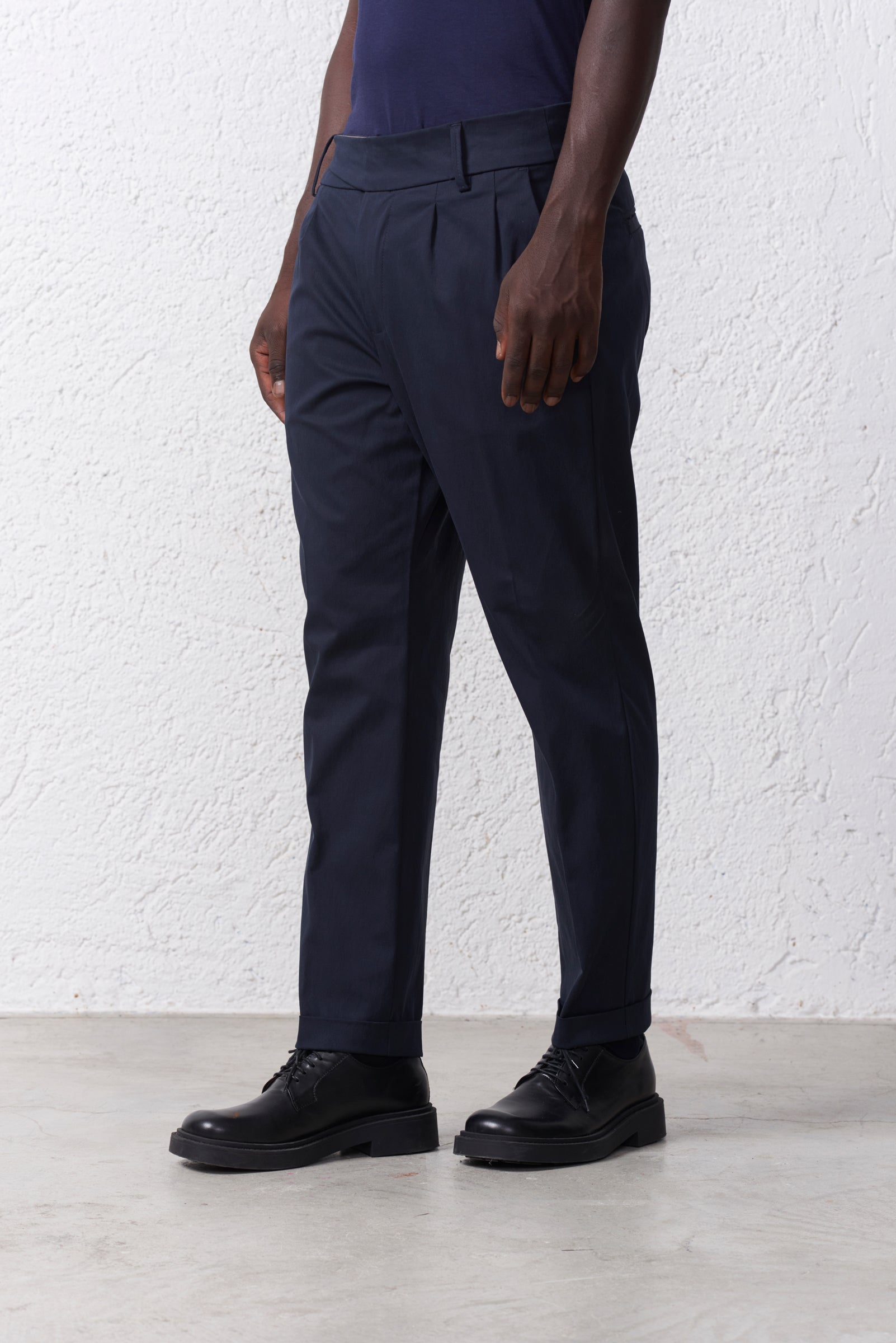 La patta con zip è completata da una costruzione pulita e minimale sul davanti, che esalta la linea del capo. Il fondo con risvolto aggiunge un tocco di classe e rende il pantalone perfetto sia con stringate eleganti che con mocassini.