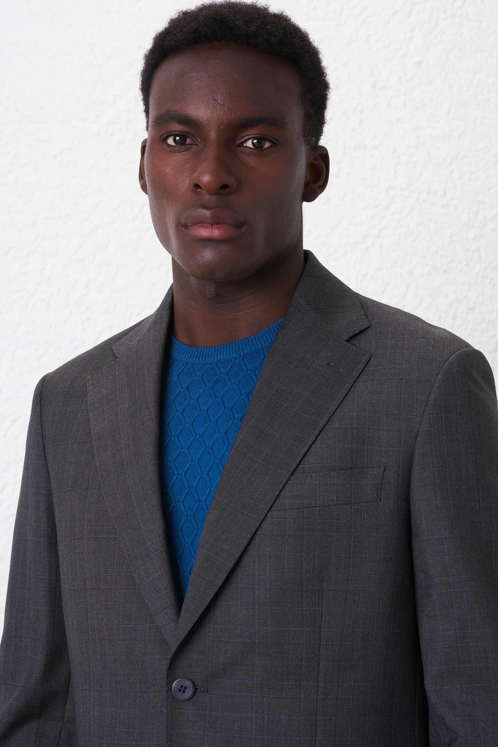 This men's single-breasted suit, crafted from a premium viscose blend, features a sophisticated Prince of Wales check pattern in refined shades of blue and gray. Featuring a wide 10 cm lapel and enhanced with tailored details such as stitching around the lapel, pockets, and breast pocket, the jacket exudes attention to detail and timeless style. The regular fit, structured construction with shoulder pads, double back vents, and internal lining ensure comfort and impeccable wearability. The classic trousers, with open seams and a non-slip belt, ensure a neat fit for the shirt, completing a suit designed to convey elegance and authority in any formal and business setting.