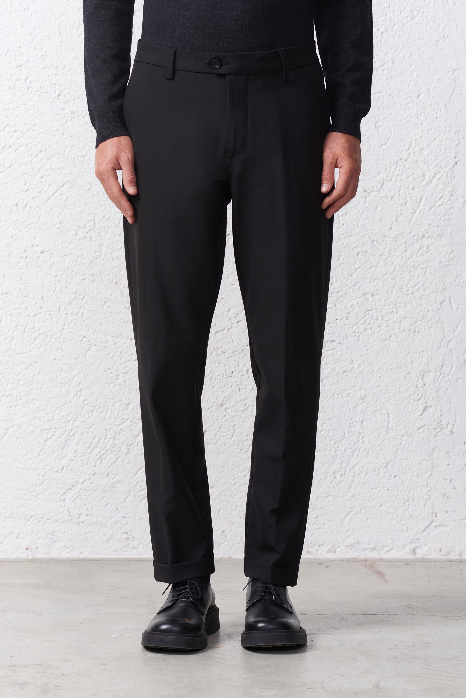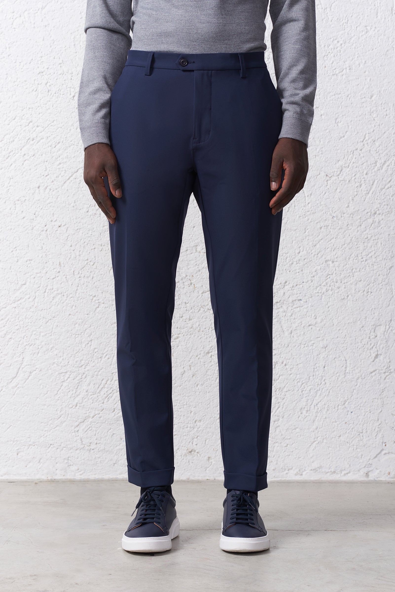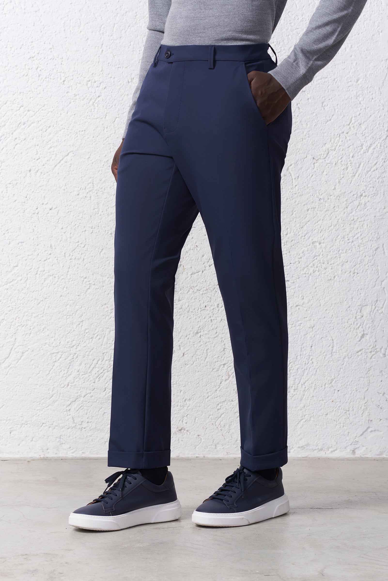 High-twist trousers with double pleats, high placket, and two buttons. Regular fit, tailored details, available in dark brown, beige, blue, black, and burgundy.