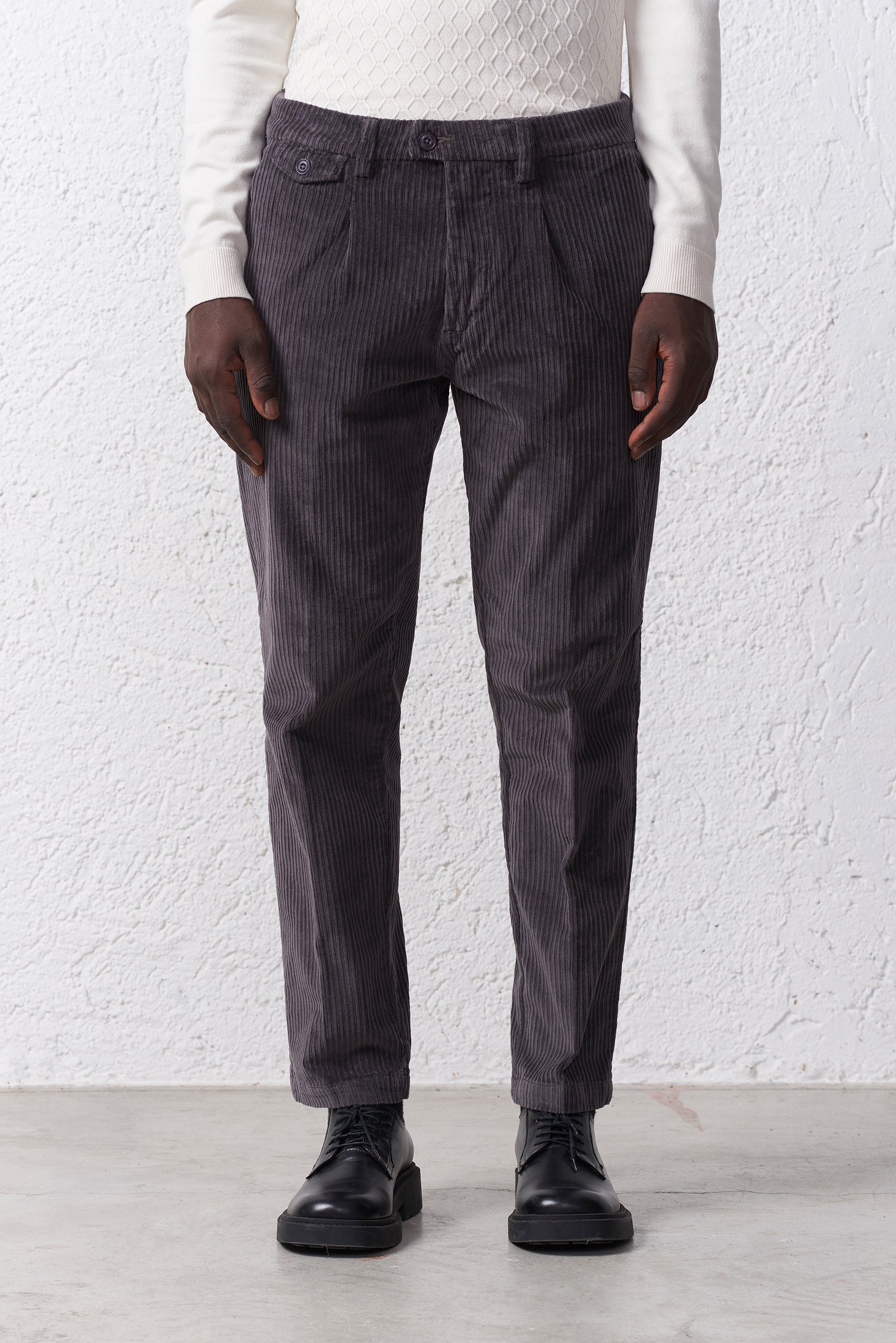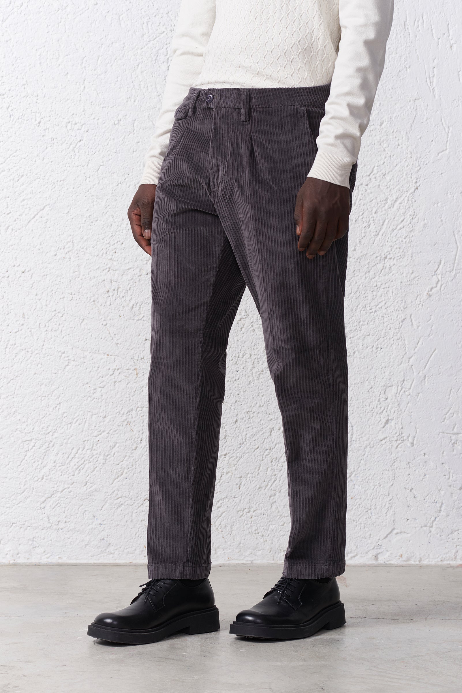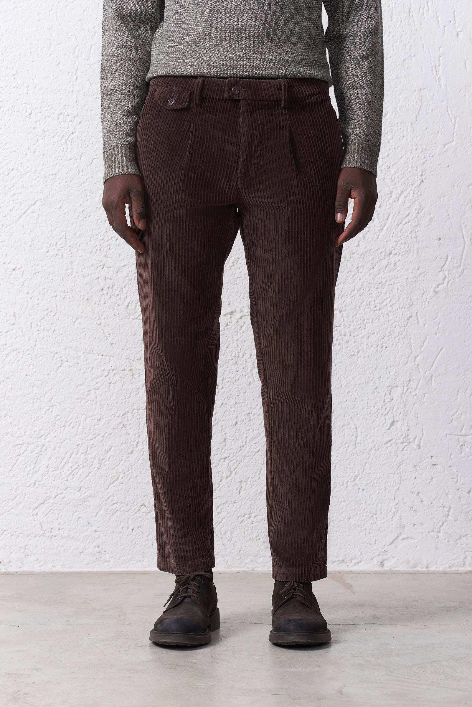 High-twist trousers with double pleats, high placket, and two buttons. Regular fit, tailored details, available in dark brown, beige, blue, black, and burgundy.